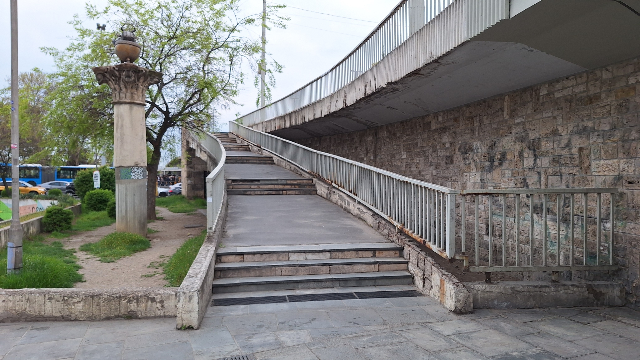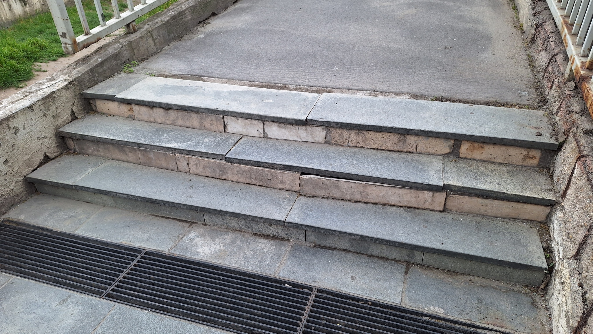 A Boráros téri aluljáró E kijáratánál lévő lépcső darabokban van, több ponton a burkolata kimozdult, jelen állapotában balesetveszélyes.