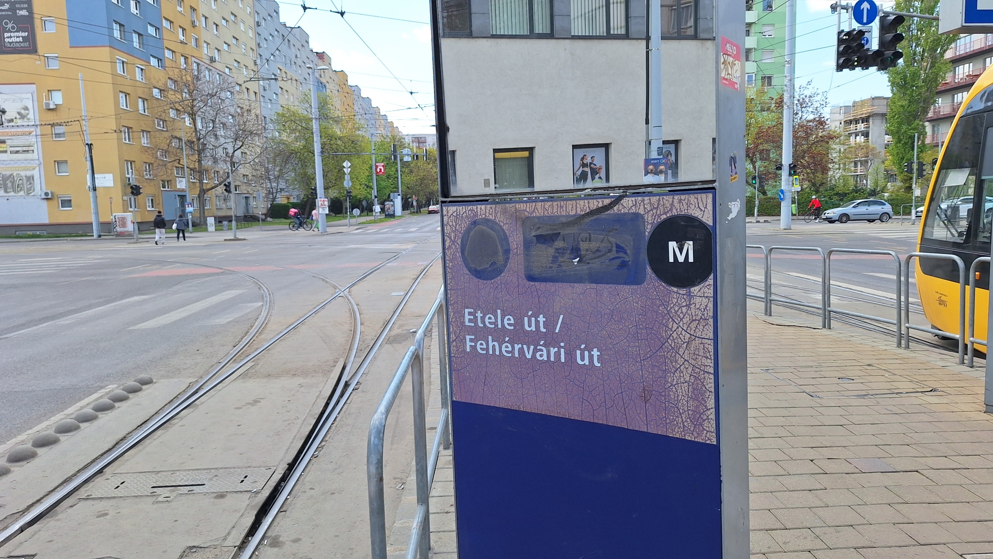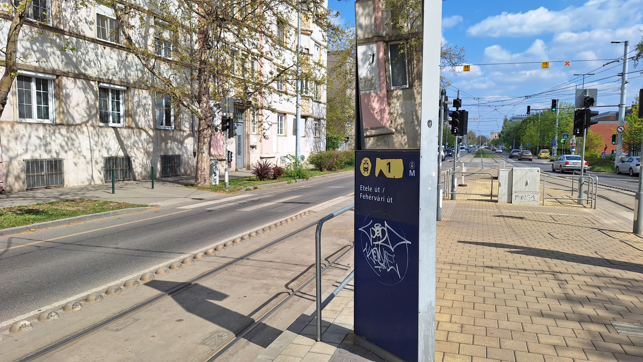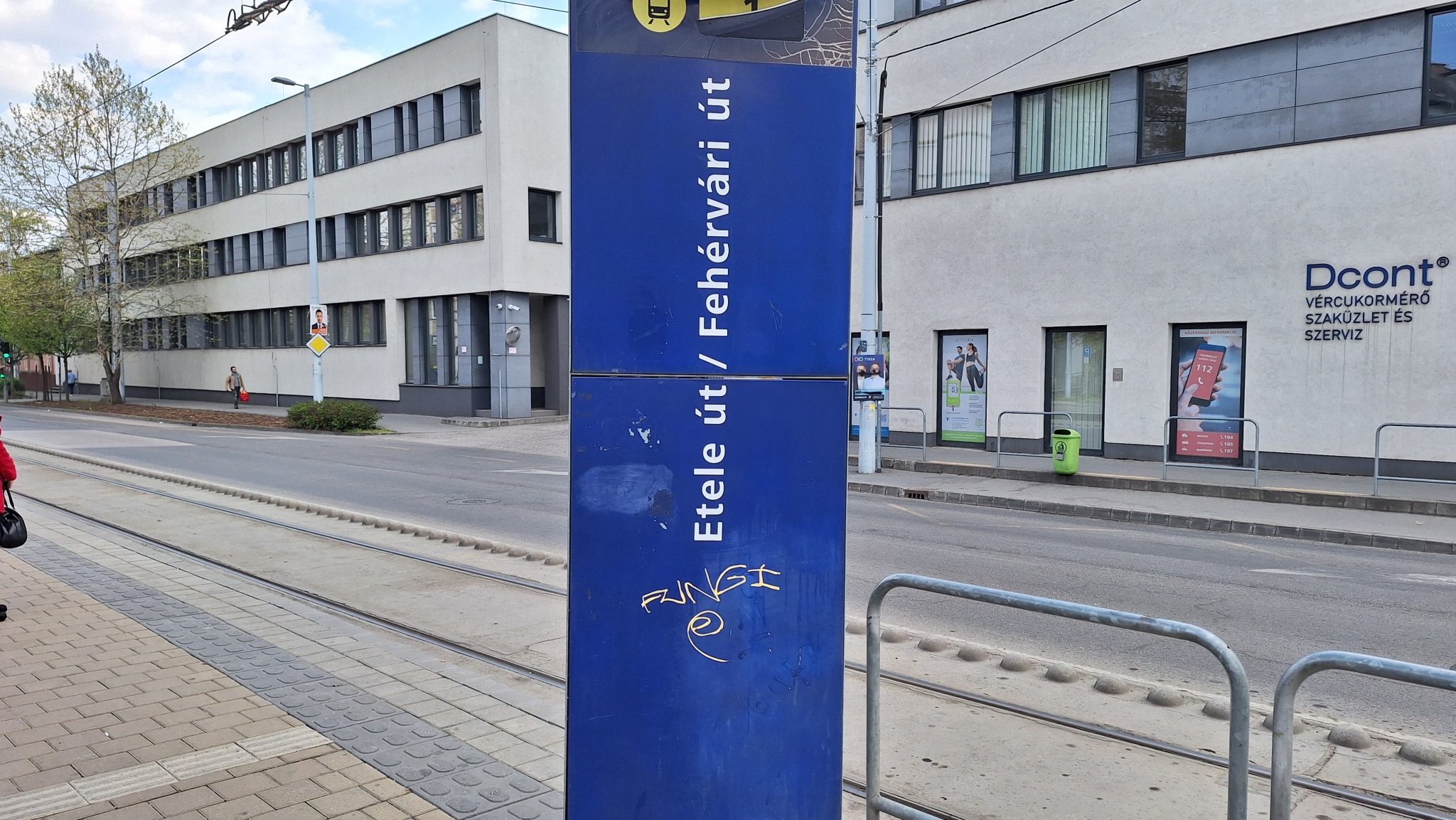 Az 1-es villamos Etele út / Fehérvári út megállójában elég leharcolt állapotban vannak a megállótáblák, várók. Minden tele van firkálva, ragasztgatva, a megálló hivatalos matricái le vannak szakadva, meg vannak barnulva.