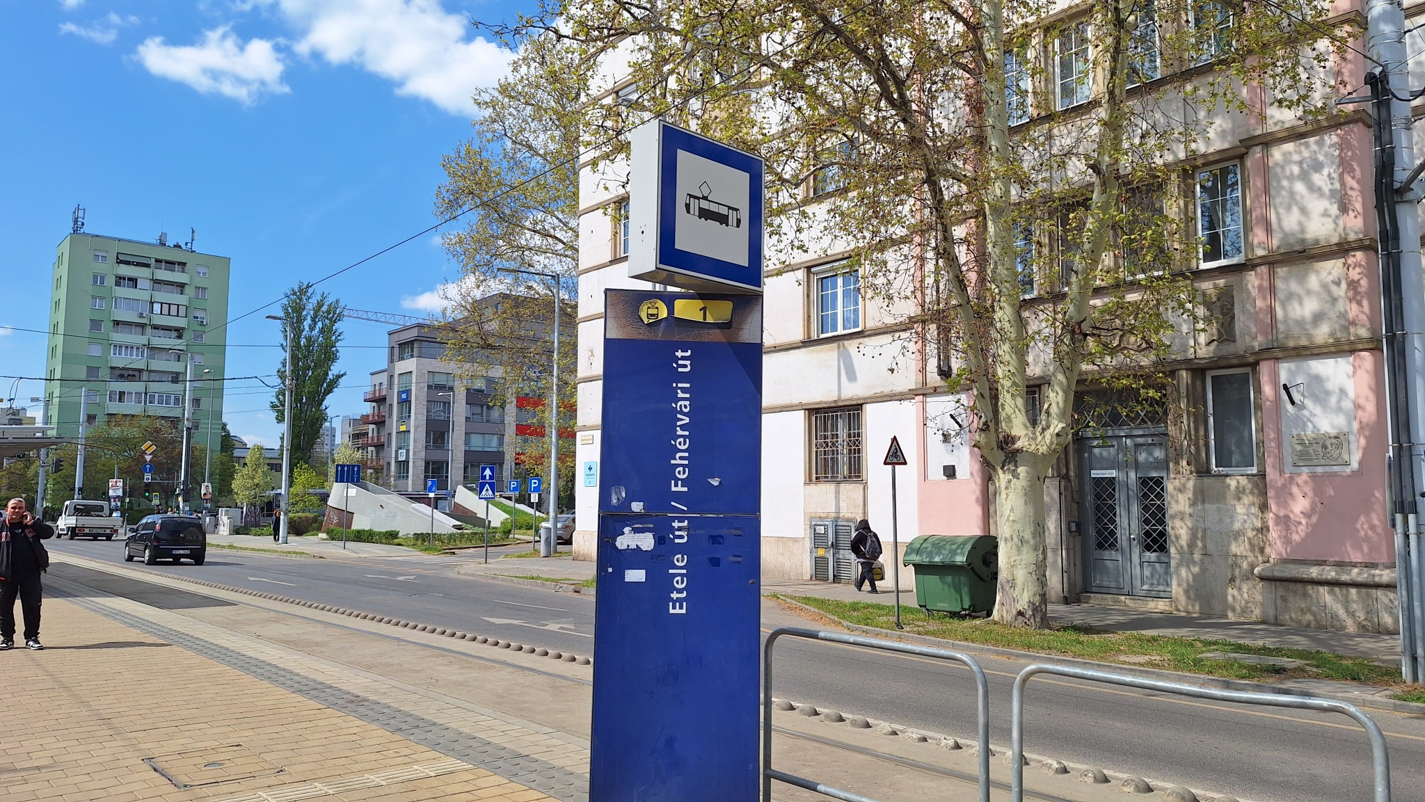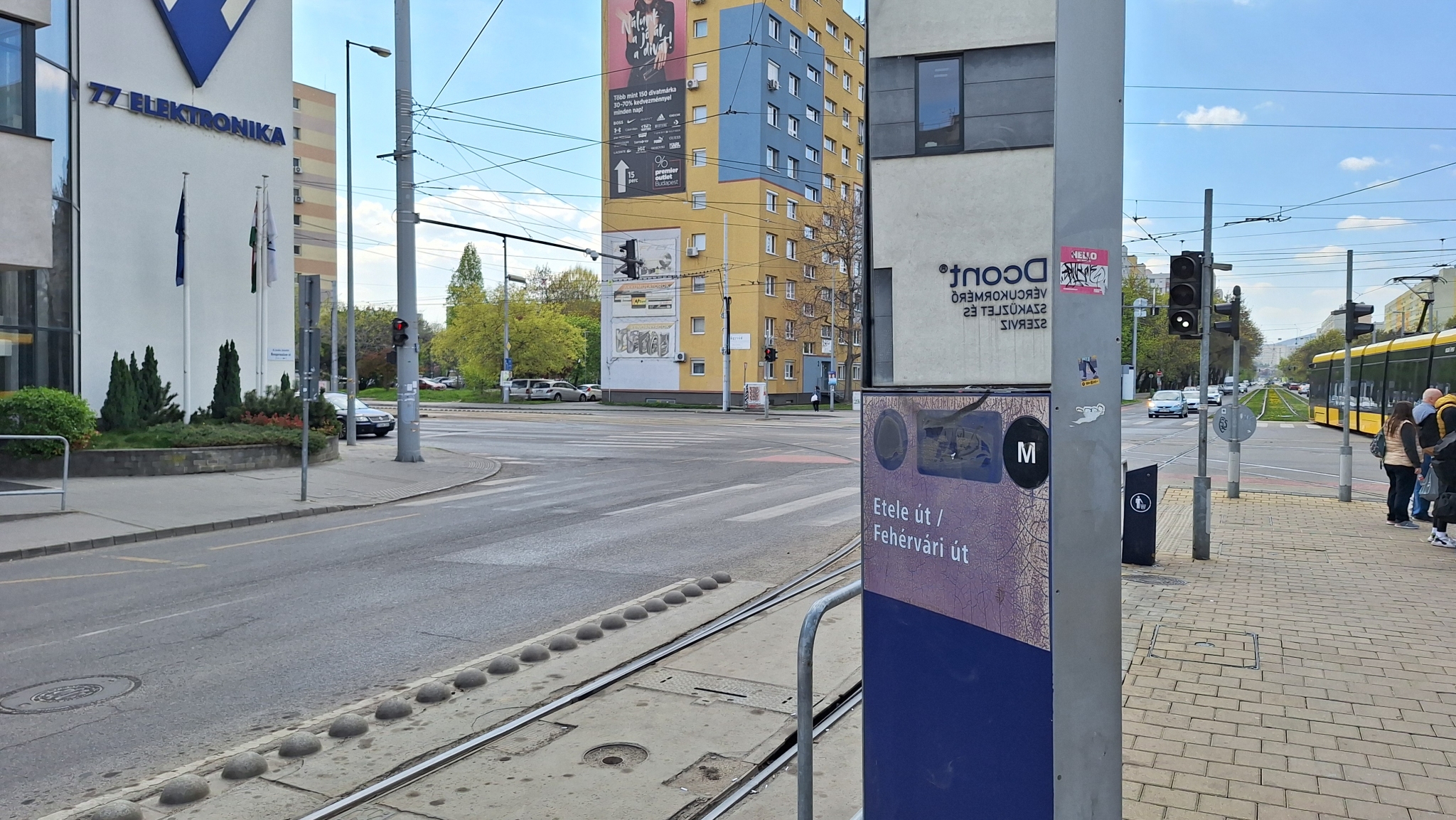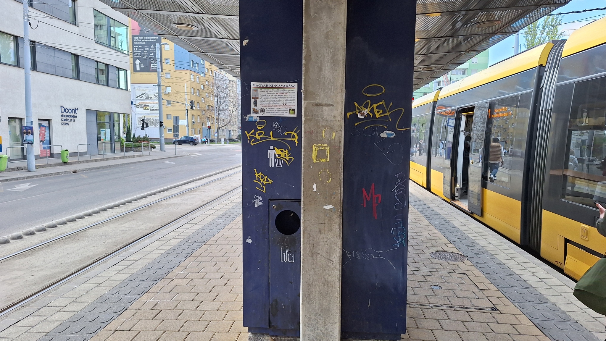Az 1-es villamos Etele út / Fehérvári út megállójában elég leharcolt állapotban vannak a megállótáblák, várók. Minden tele van firkálva, ragasztgatva, a megálló hivatalos matricái le vannak szakadva, meg vannak barnulva.