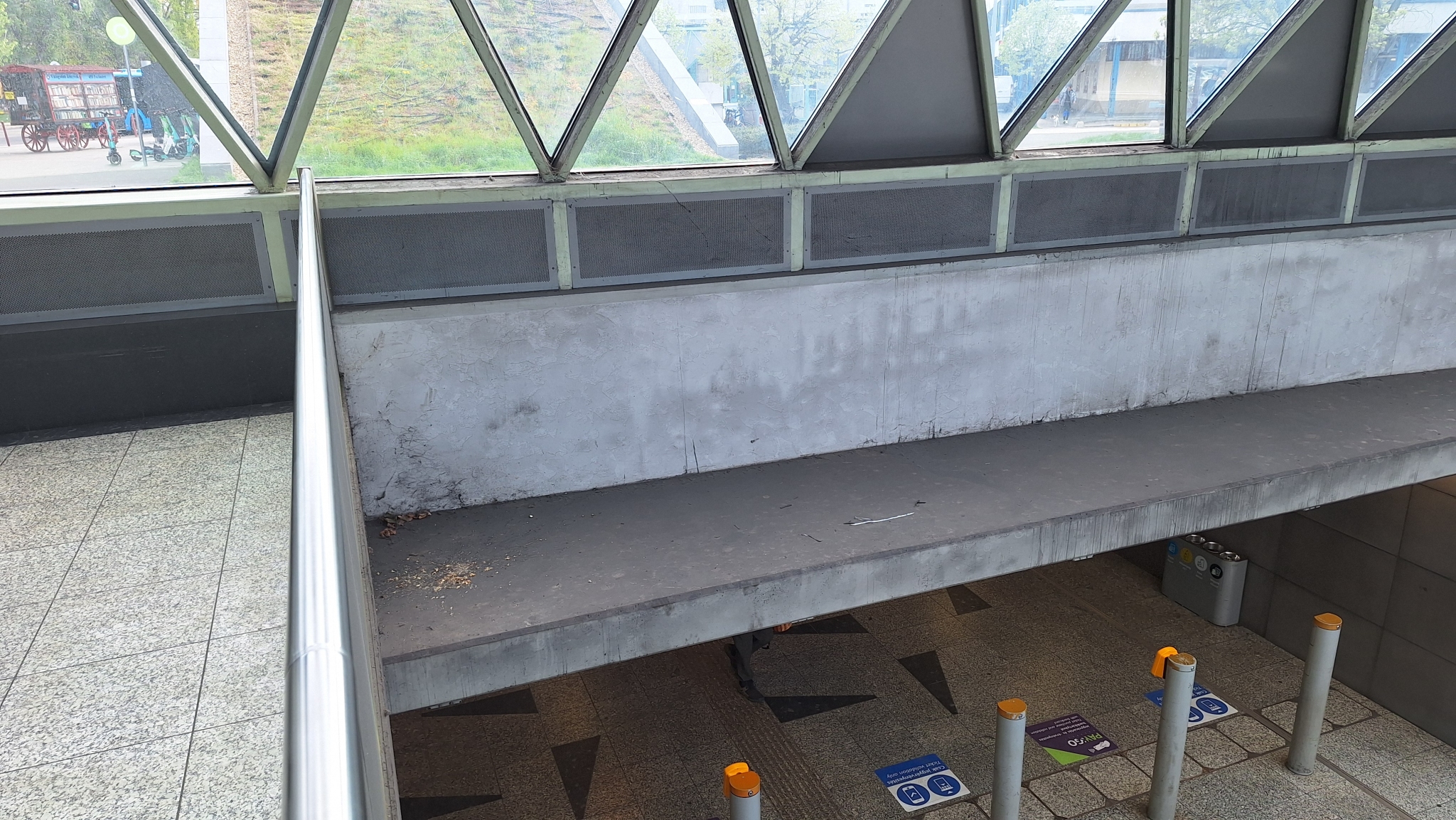 A 4-es metró Bikás park állomásépületében össze van hányva, ill. szemetelve a vasbeton födém, ami a lépcsőtől jövő járókelők feje fölött van.