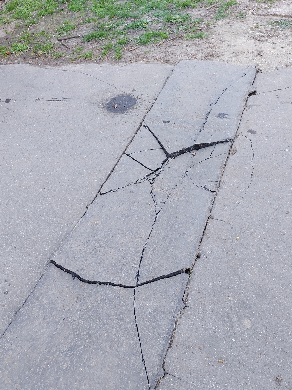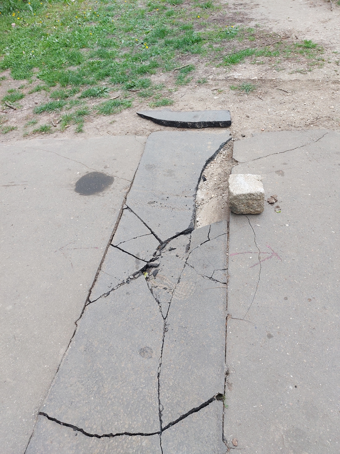A képeken látható járda burkolata megrepedt, feltöredezett, amely így beszakadhat és balesetveszélyessé válhat. A két kép között egy hét telt el (április 7. és 14.).
