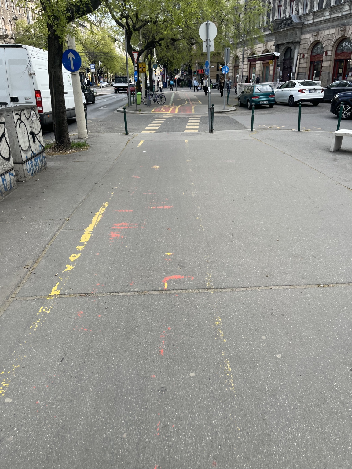 A képen a járdán található szakasz van de hasonló az állapot a körútról járdára torkolló biciklisávnál is!