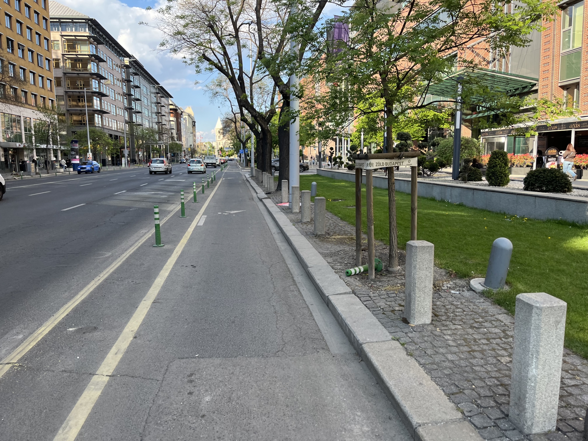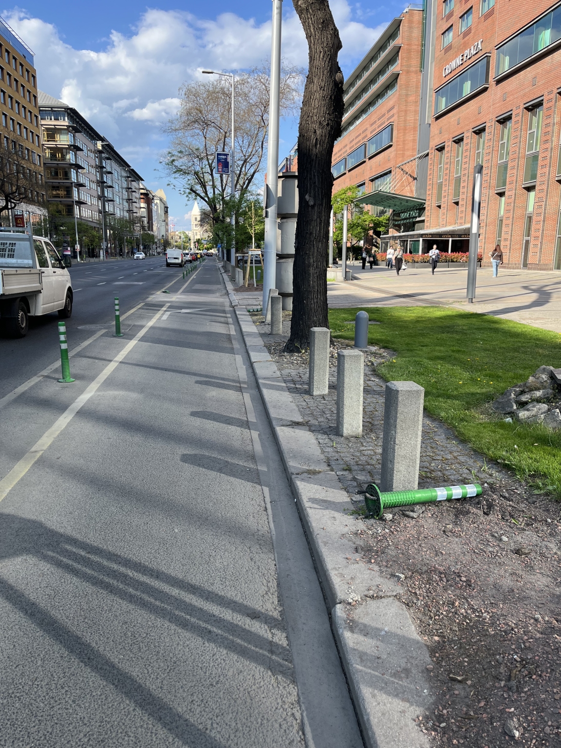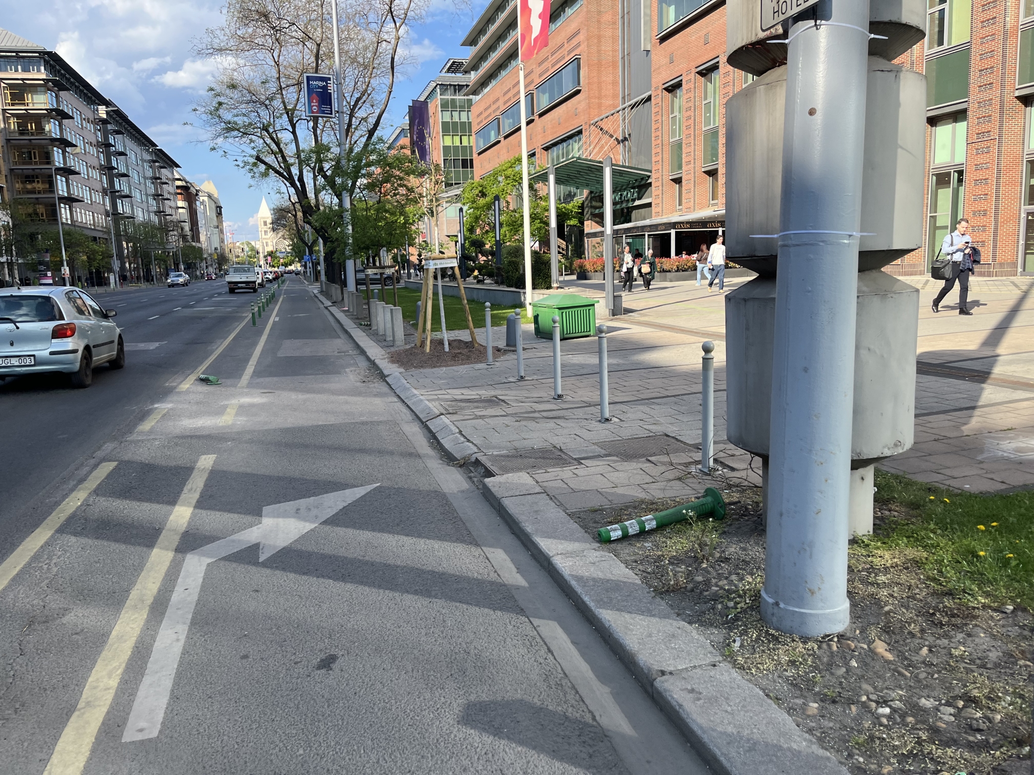 Zöldsávban hevernek a pollerek a kerékpársáv védelme helyett