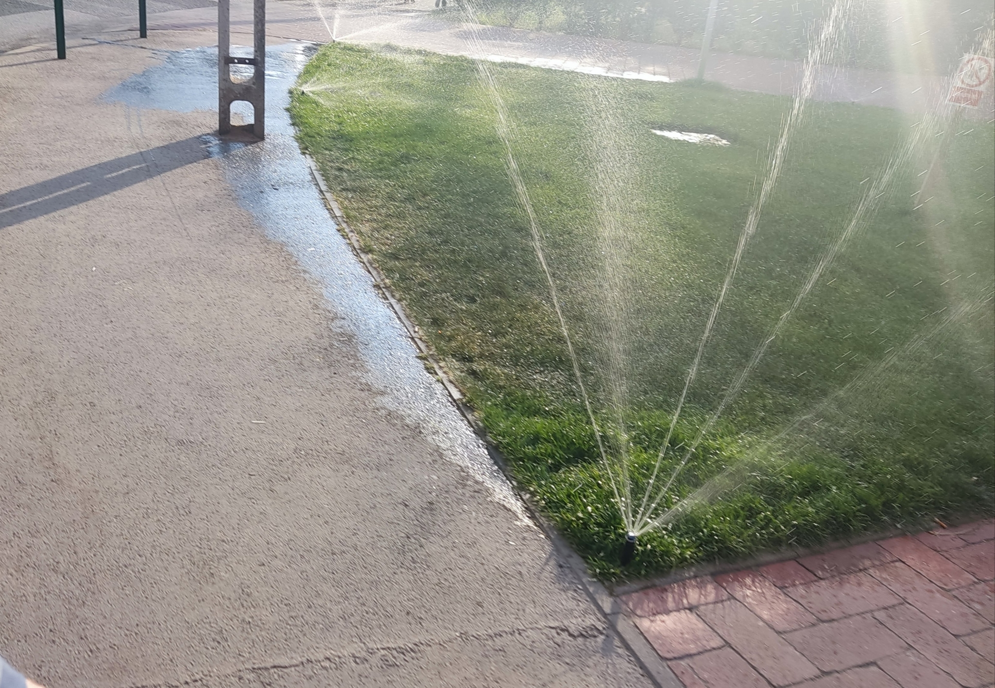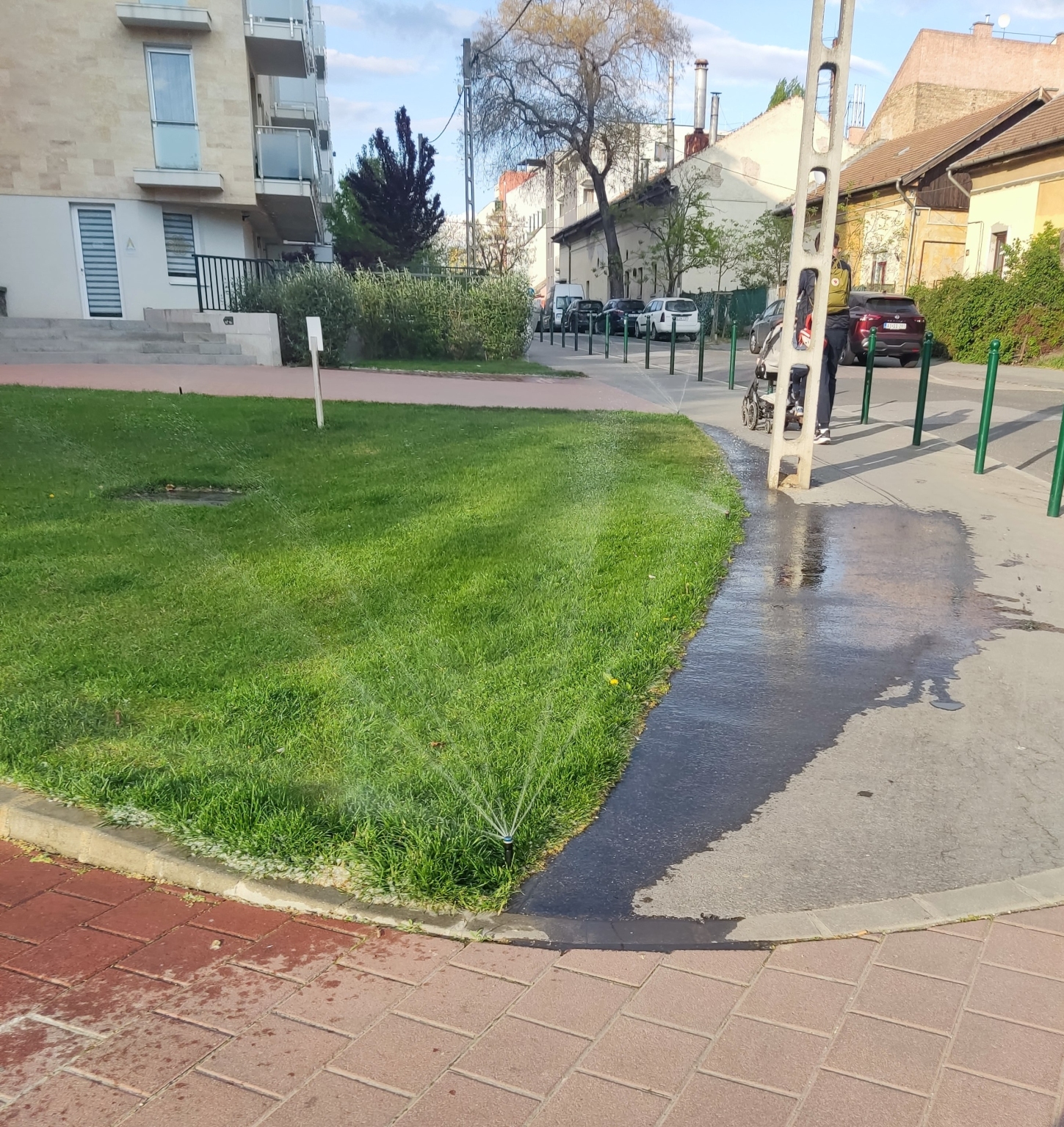 Járdára spiccel a locsoló, nem fér el mellette szárazon a babakocsi.