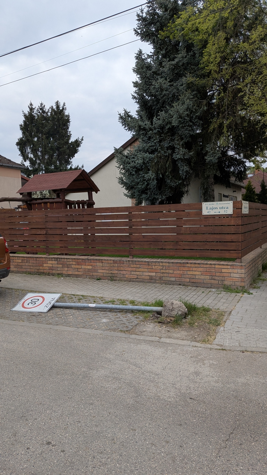 A XVI. kerületben, a Lajos utca és a Rákosi út sarkán kidőlt egy 30-as zóna tábla.