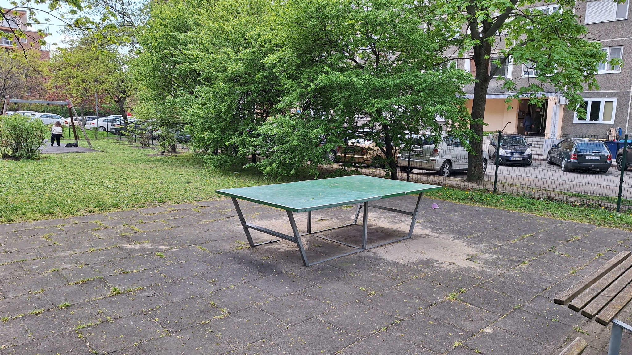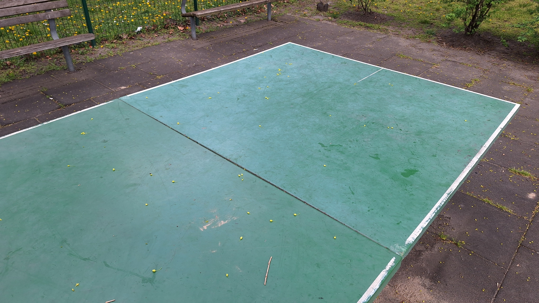 Az Etele út 46A előtti téren lévő pingpongasztalnak nincs hálója, jó lenne rá valamilyen fémből vagy műanyagból készült fix hálót szerelni a szabályos játékhoz.