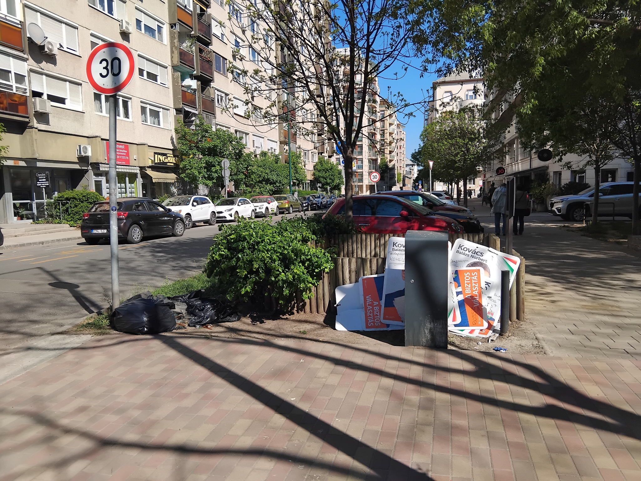Üvegdarabok zsákban, meg egyéb szemét a sarkon.