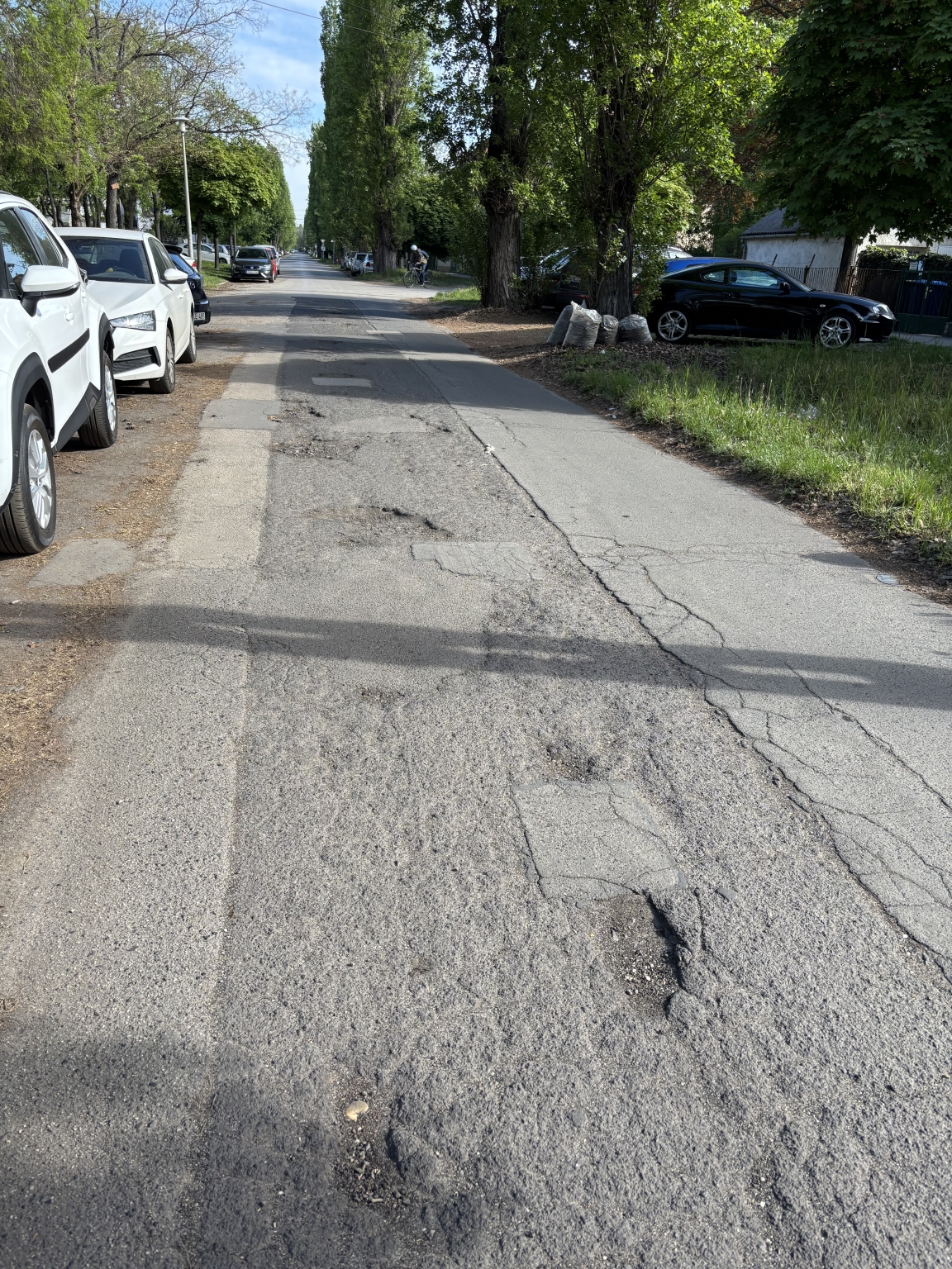 A XIX. kerület Pannónia út 52. szám előtt rengeteg kátyú van végig az úton. Kérem az illetékes javítsa ki.