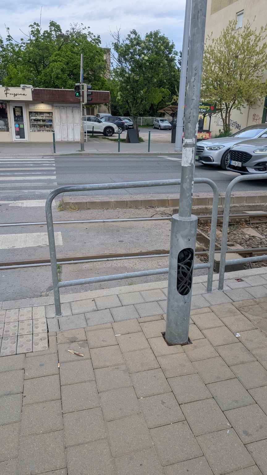 A Vörösvári úton a Körte utcánál a középszigeten hiányzik egy oszlop szerelőajtaja.