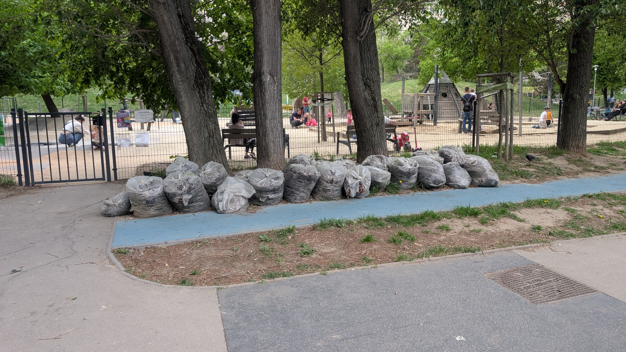 A Holdudvar játszótér Ágoston utcai bejárata mellett egy jó adag bezsákolt zöldhulladék várja az elszállítást.