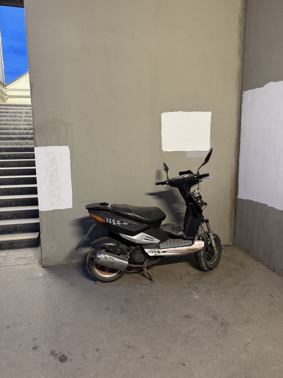 A képen látható robogó már jó ideje félig szétszedett állapotban all a MÁV Aquincum megálló lépcsője alatt. Szeretném kérni eltávolítását.