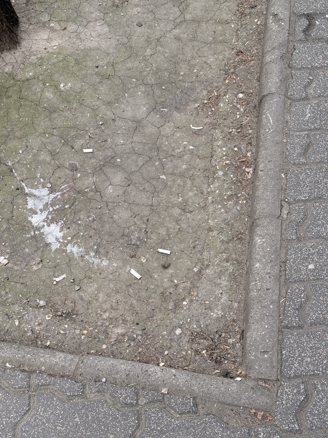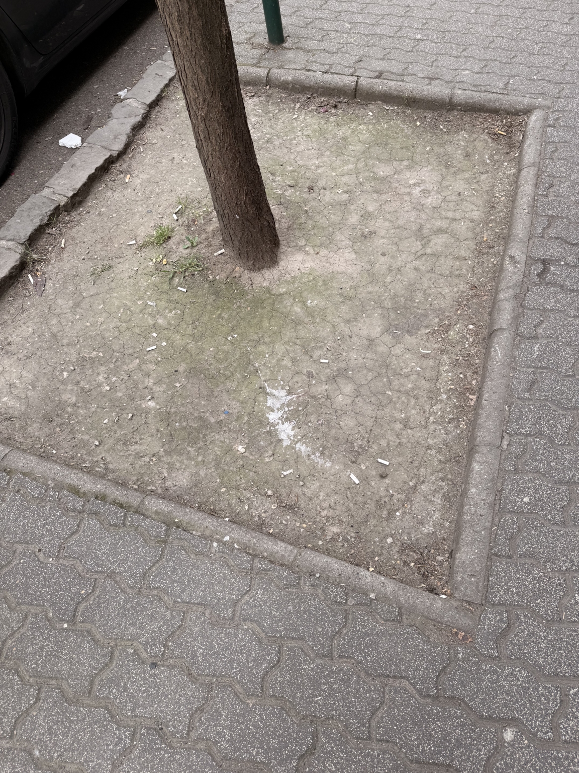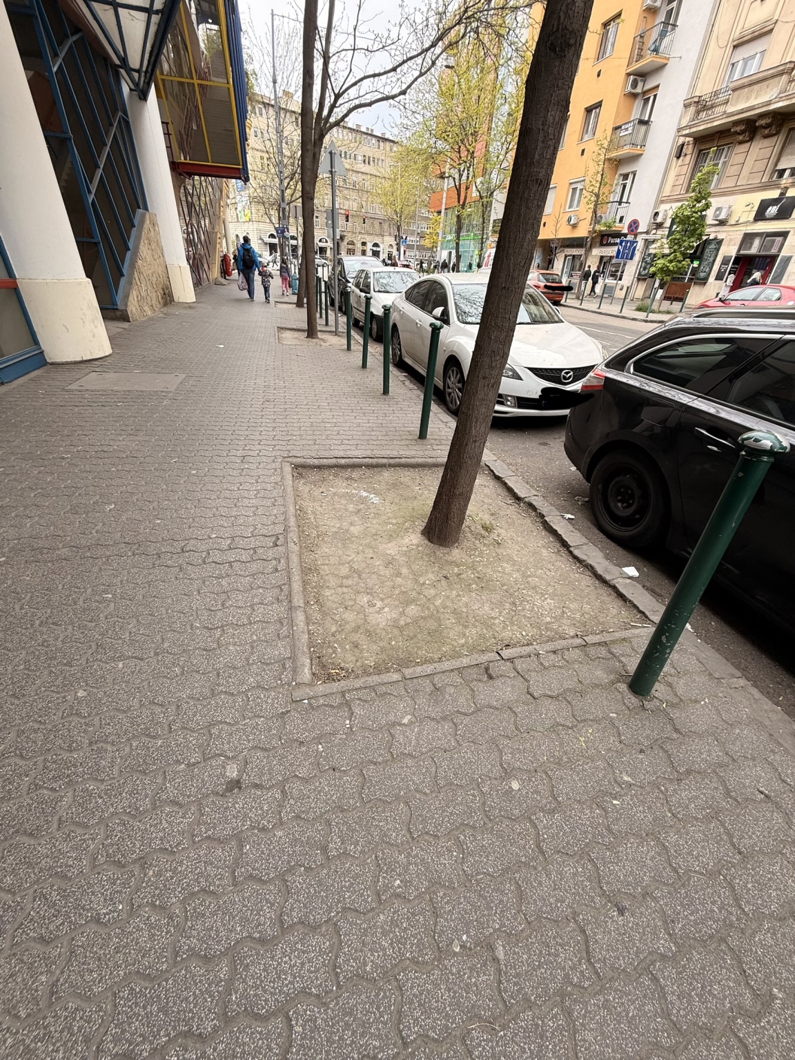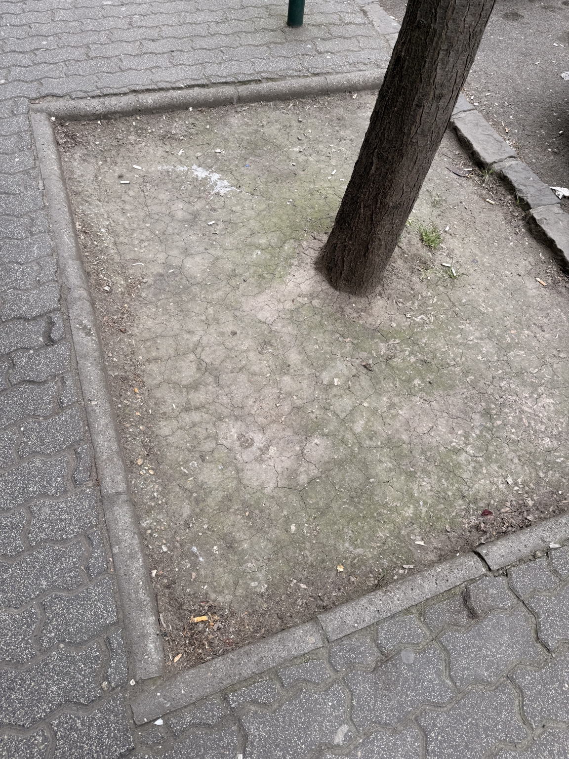 Beton keménységűre tömörödött föld van a fák körül. Több helyen is 5-10 cm mélyedés van közvetlenül a járdába lógó fa körüli árkokból. Javítani kellene a talaj minőségét és feltölteni, majd körbe keríteni, hogy ne tapossák le újra az emberek.