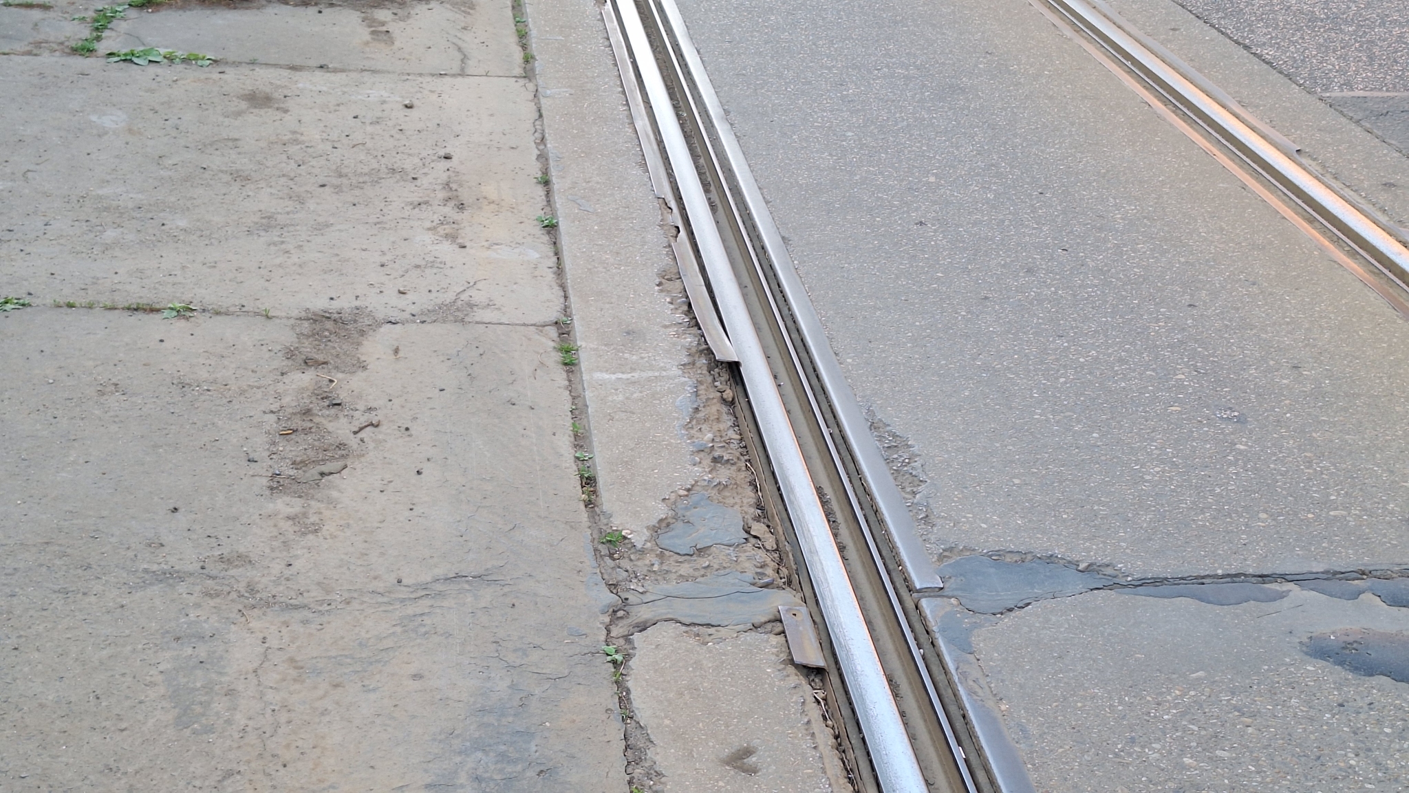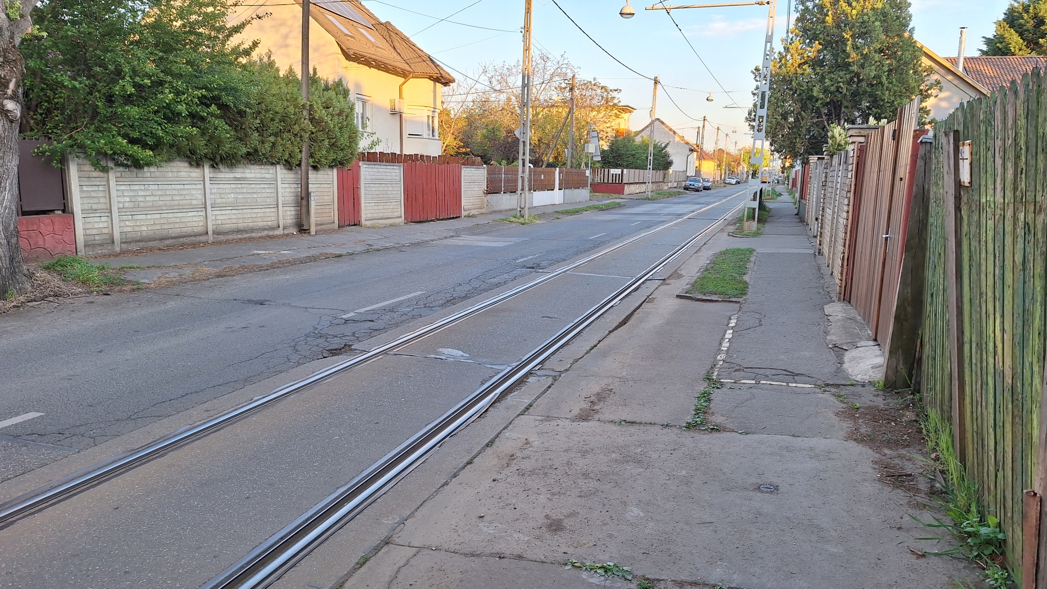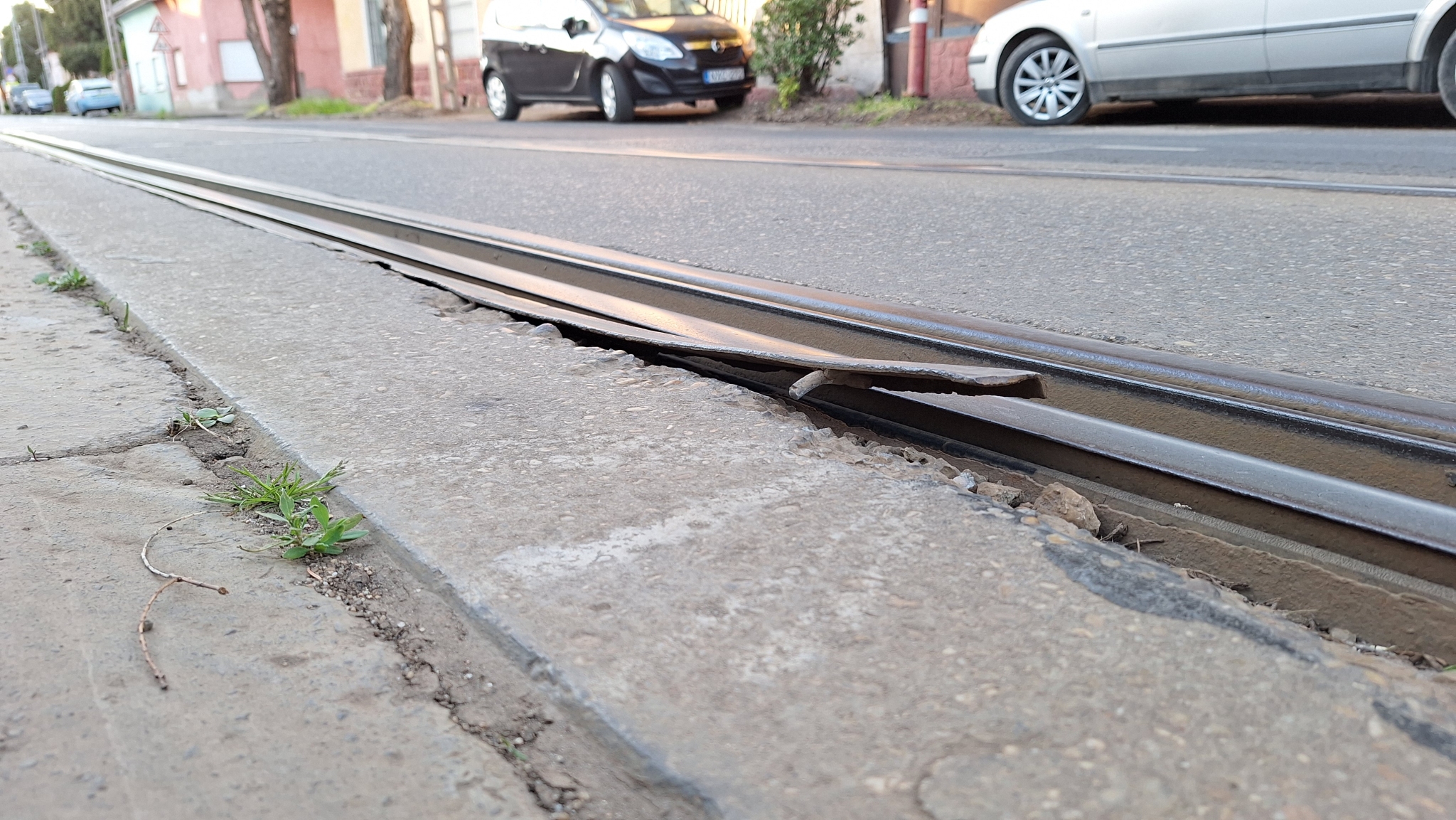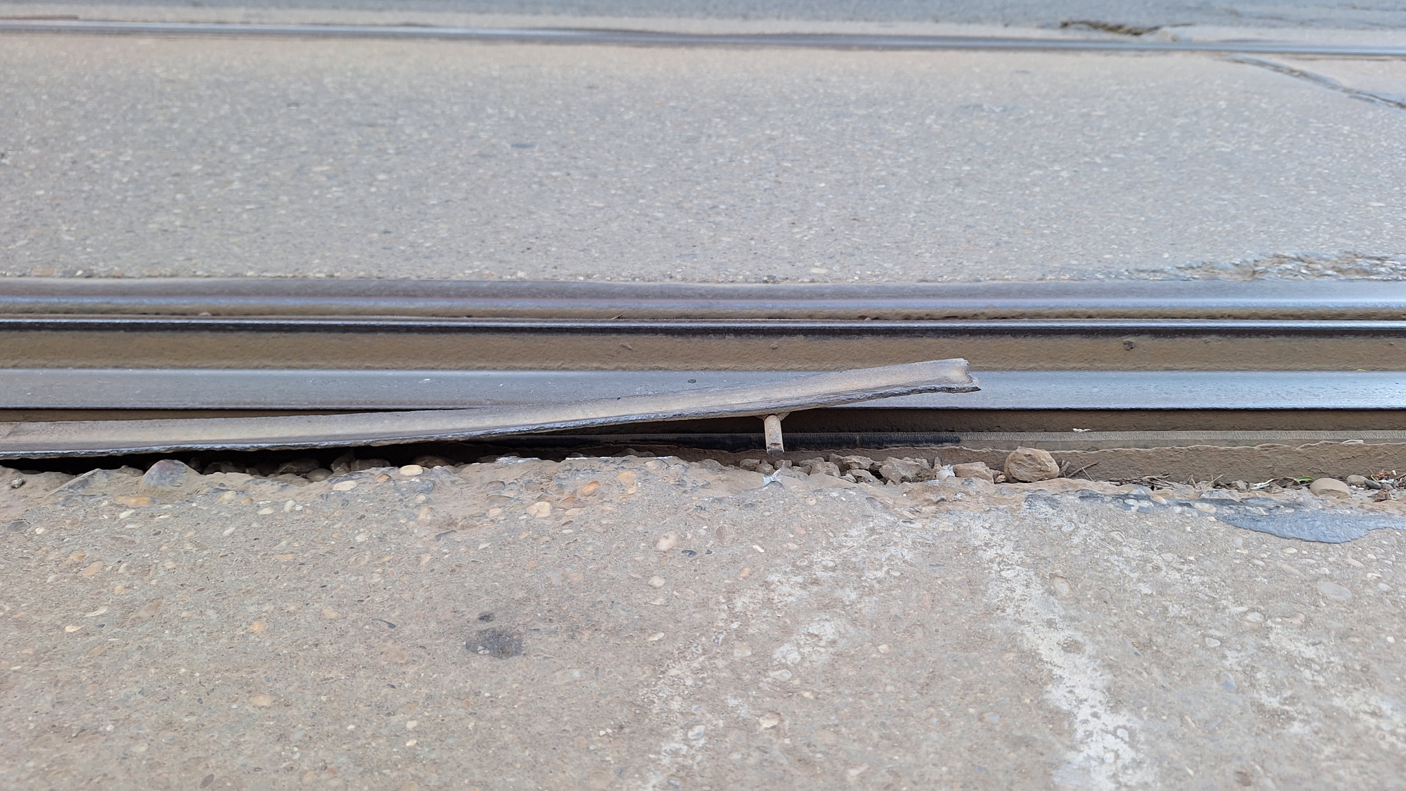 A Vörösmarty utca 138/B előtt eltört és felhajlik, csattog a 2b villamos síne.
