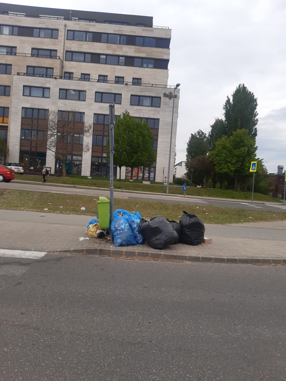 A Bp 13. ker. Madarász Viktor utca Juta utca sarkánál a Tesco meletti szerviz uton lévő közterületi hulladékgyüjtő köré k.b. 1,5 hete valaki(k) több zsák szemetet helyezett el. A zsákok már kezdenek kiszakadni, a szemét pedig kihullani.
