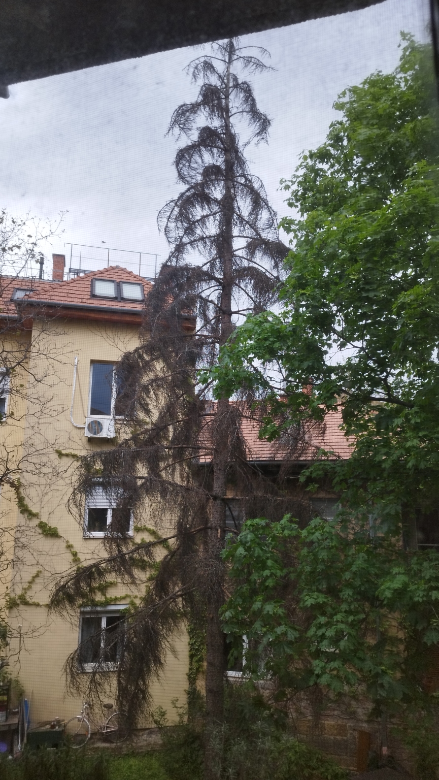 Karolina út 16 szám alatt a telek végében van egy fenyő elég rossz állapotban. Lógnak az ágai, ki van száradva. Félő, hogy egy vihar során ki fog dőlni.