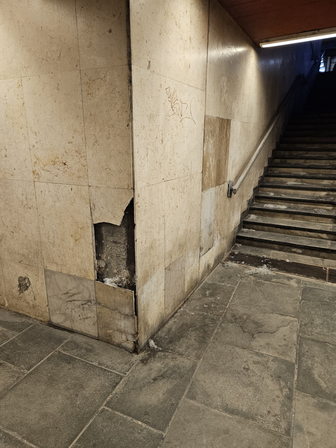 A Boráros téri aluljáró J kijáratánál van egy törött fal, hiányos a csempe.