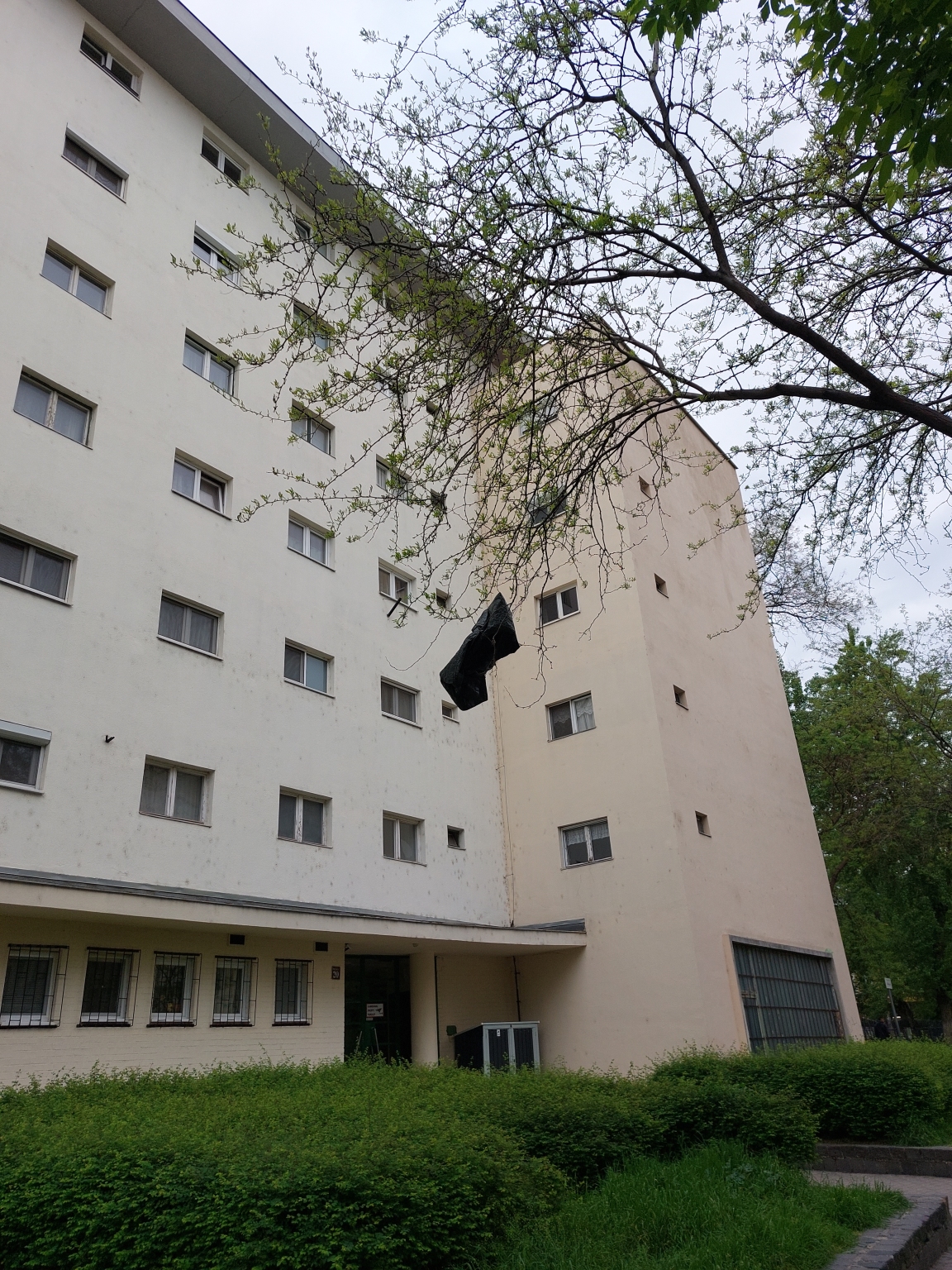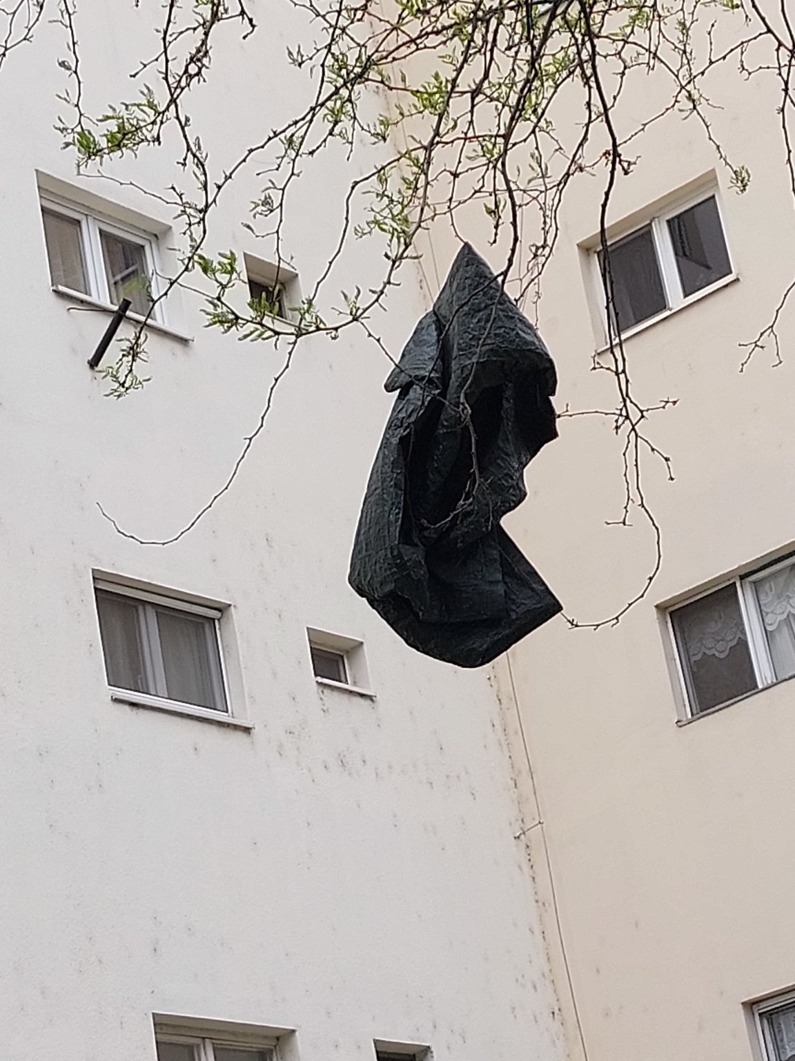 Bulcsú utca 18 előtti fán hetek óta lóg egy nagy méretű, ormótlan, fekete sittes-szemetes zsák.