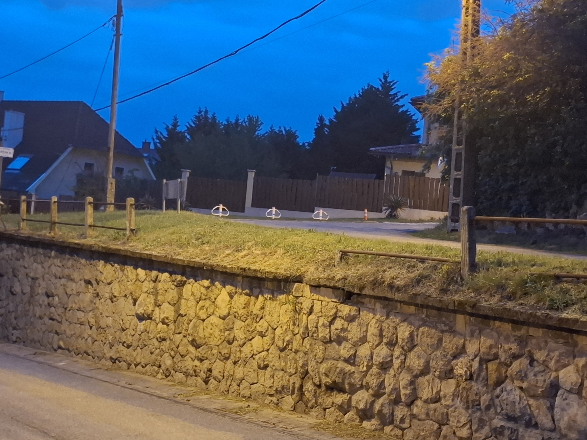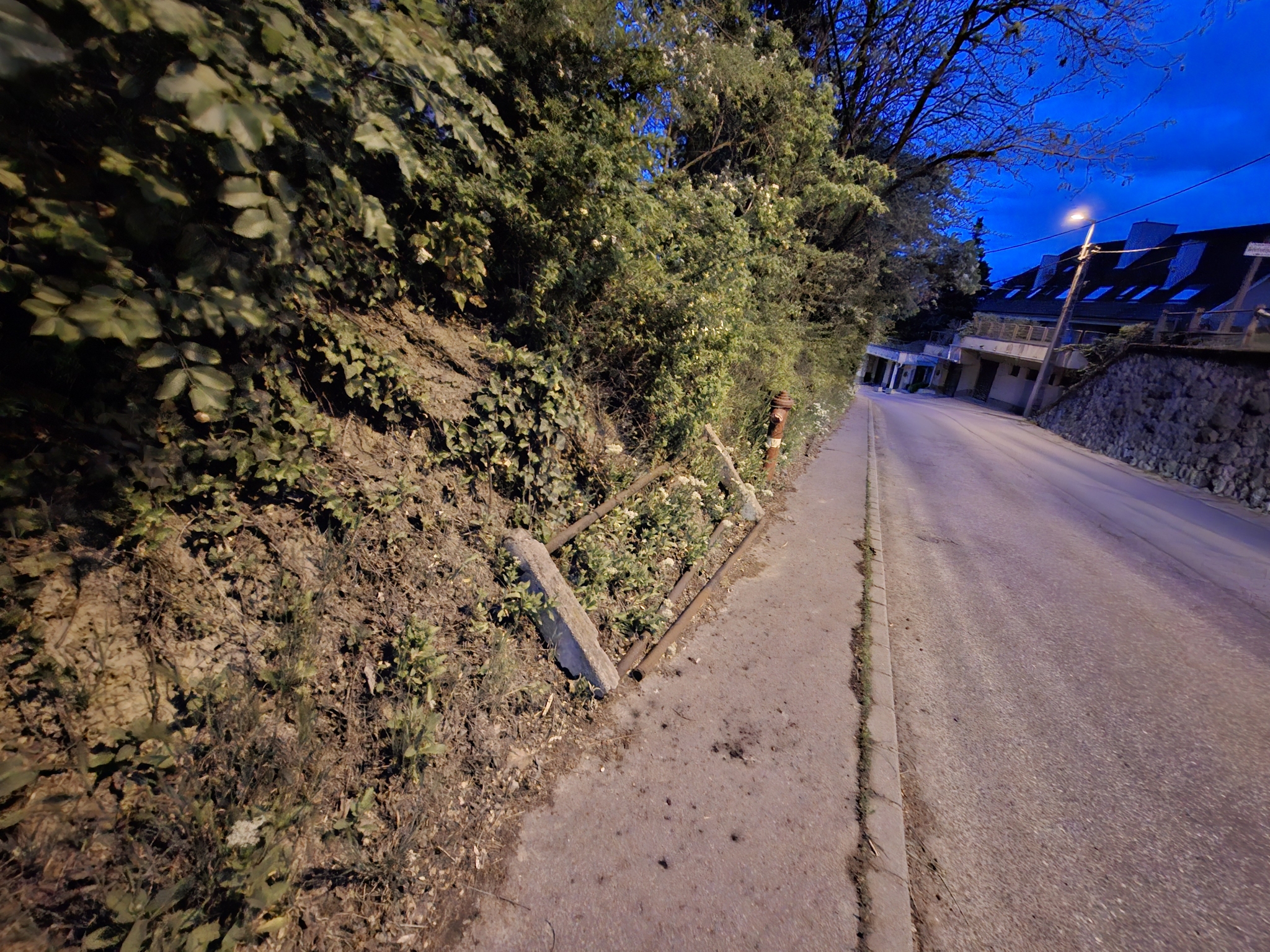 Óbudán a Viharhegyi út és Körtvélyes utca sarkán lévő támfal korlátja az azt tartó betonkockákkal együtt az úttestre esett. Valaki leszedte és az út túloldalán letámasztotta. A törmeléket el kell vinni. a korlátot meg kellene javítani.