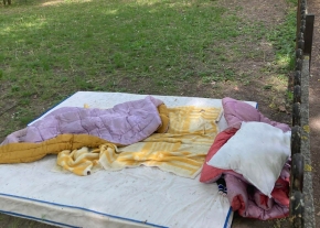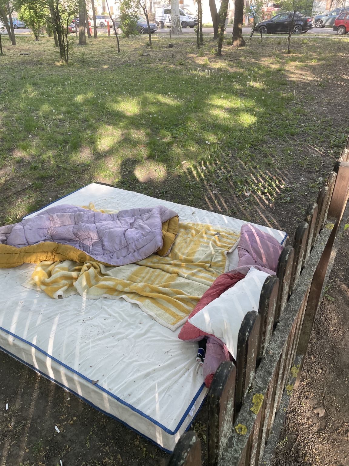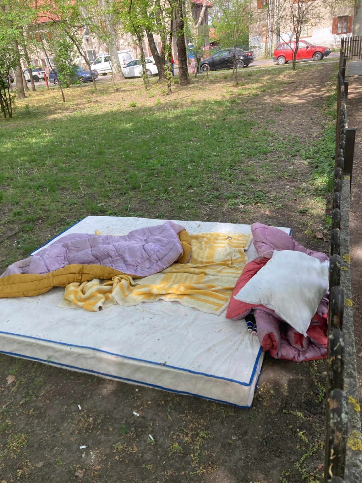 Egy komplett ágy garnitúra van a Győri Ottmár téri játszótér közvetlen közelében pár nap óta.