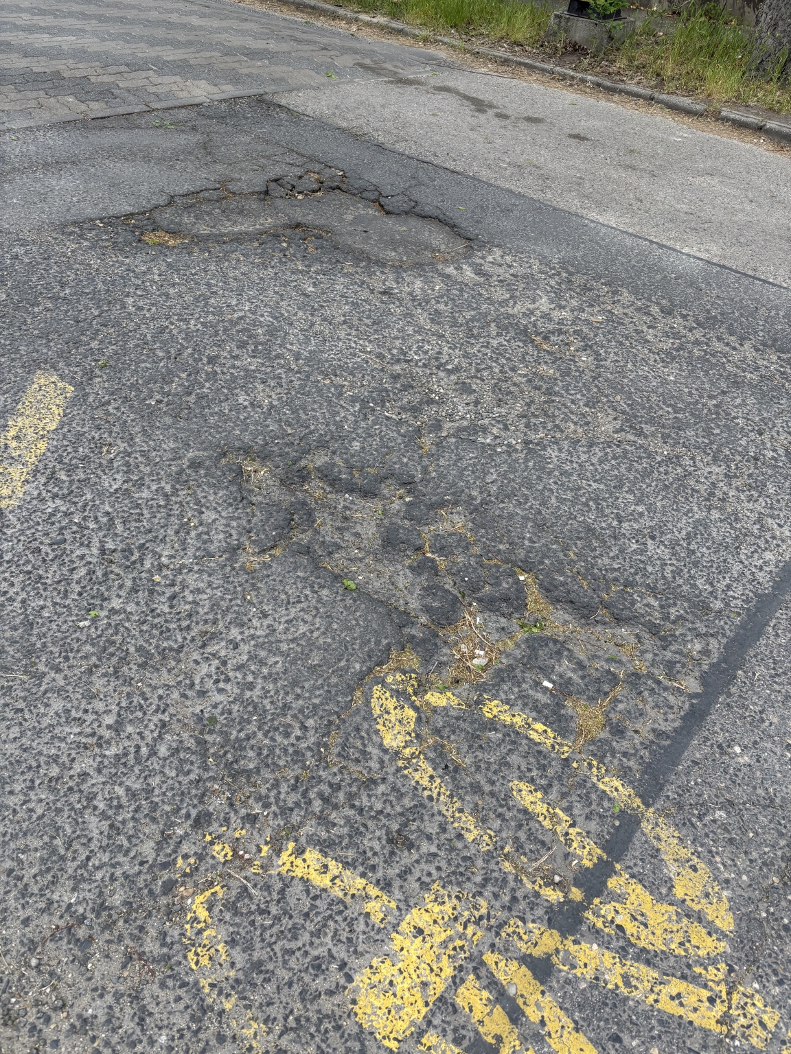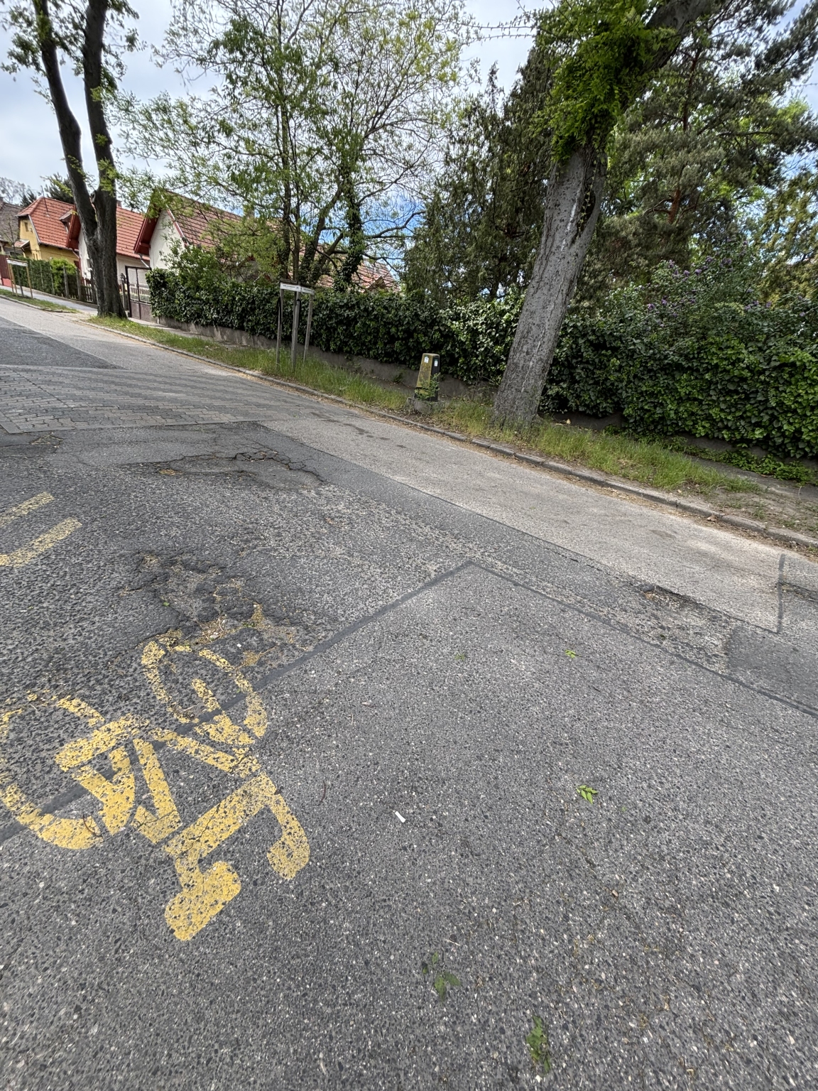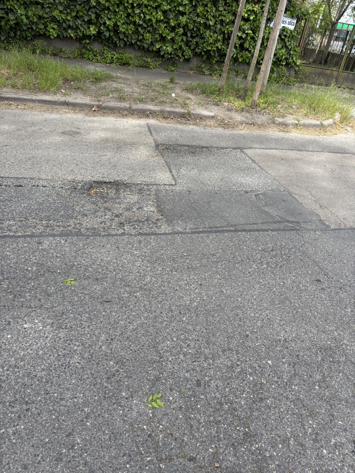 A XIX. kerület Martinovics utca 2. szám előtt több kátyú is van az úton.