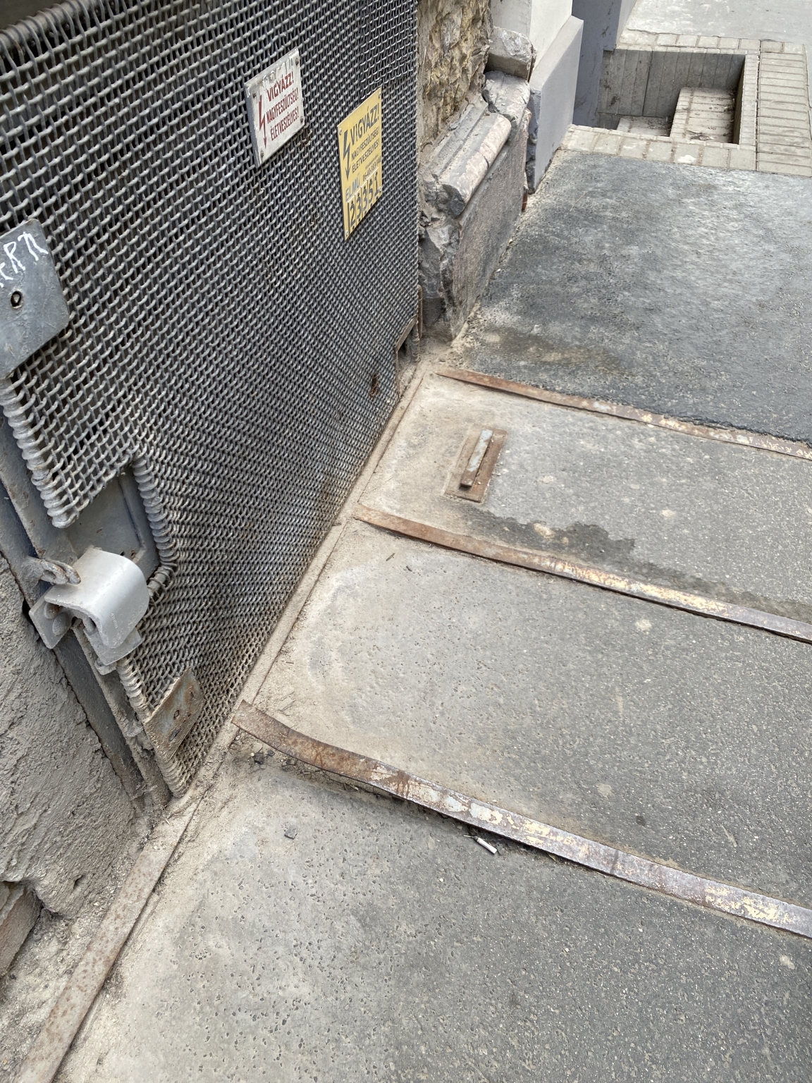 Javaslom a fém keret megjavítását, kerüljön egy síkba a járdával, valamint a pincelejárót egy növényládával jelöljék ki, hogy ne lehessen belelépni.