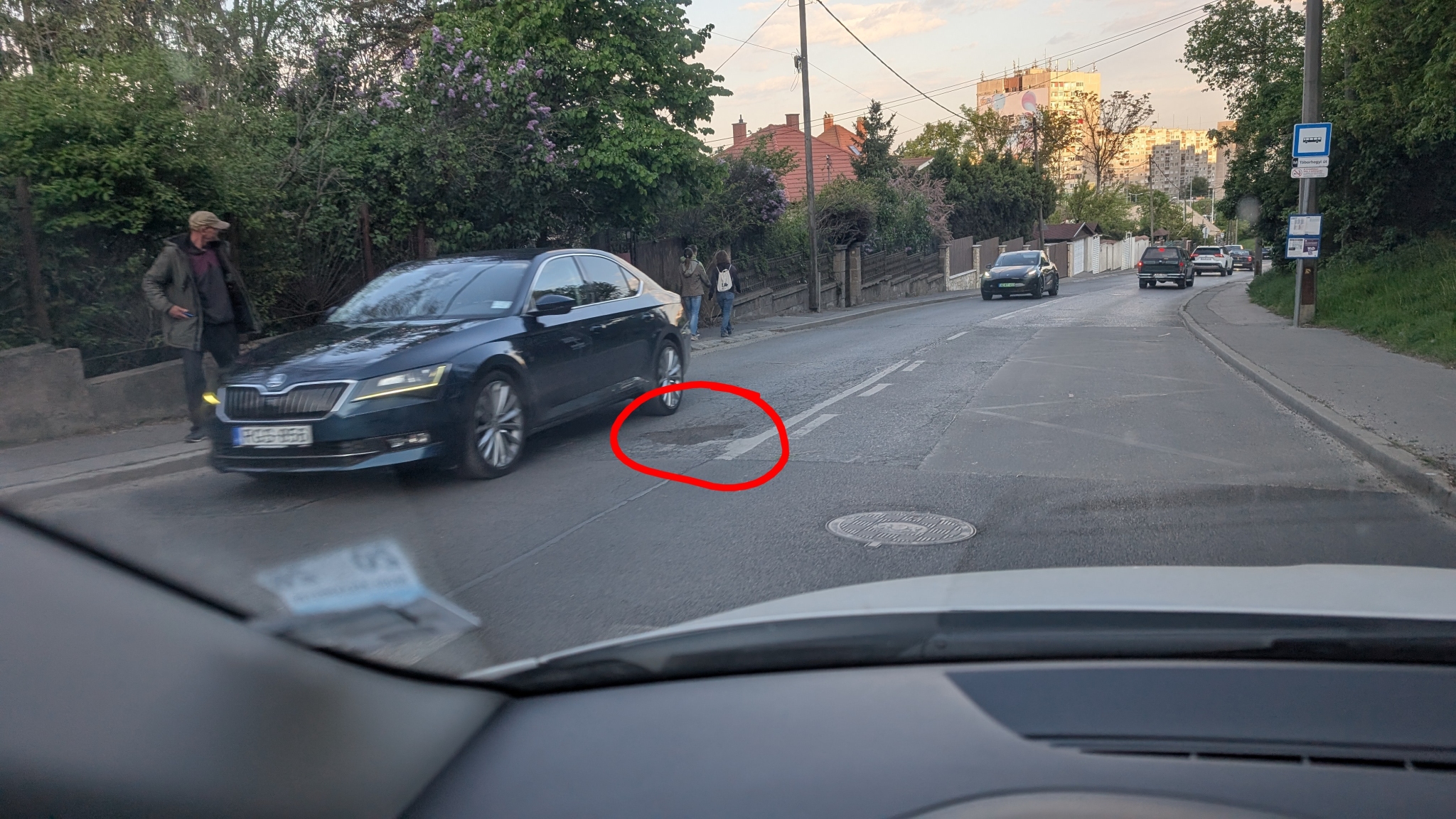 A Farkastorki úton a jelzett helyen kátyú, illetve több megsüllyedés, úthiba várja a javítást.