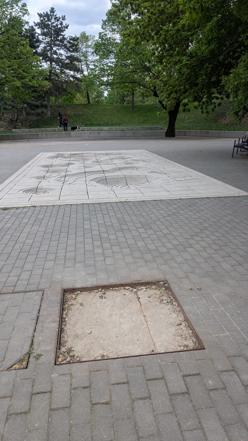 A Holdudvar parkban a szökőkút mellett az egyik aknafedlapról hiányzik a térkő. Kérjük a fedlap javítását.