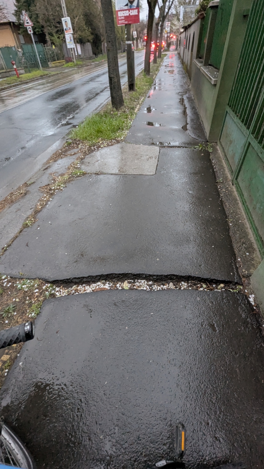 A Baross Gábor utcai Waldorf ovi előtt 3-4 helyen is 10 centi és legalább 10-15 centi széles repedések vannak a járdán. Csoda, hogy itt nem esnek el nap mint nap a gyerekek és szüleik.