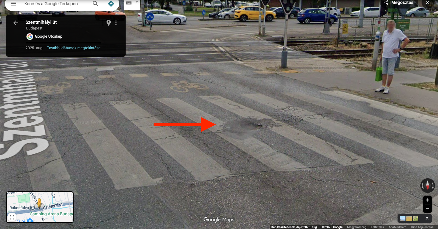 Egy nagyobb kátyú található a Szentmihályi út - Kerepesi út HÉV átjárónál.