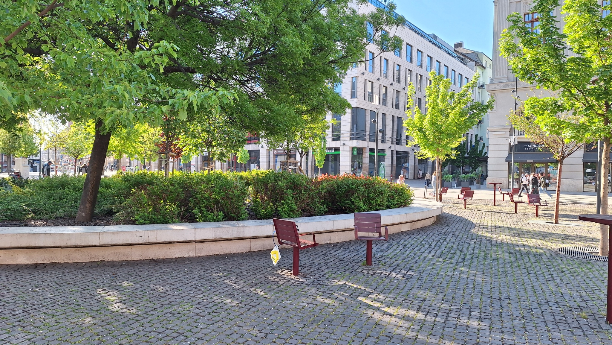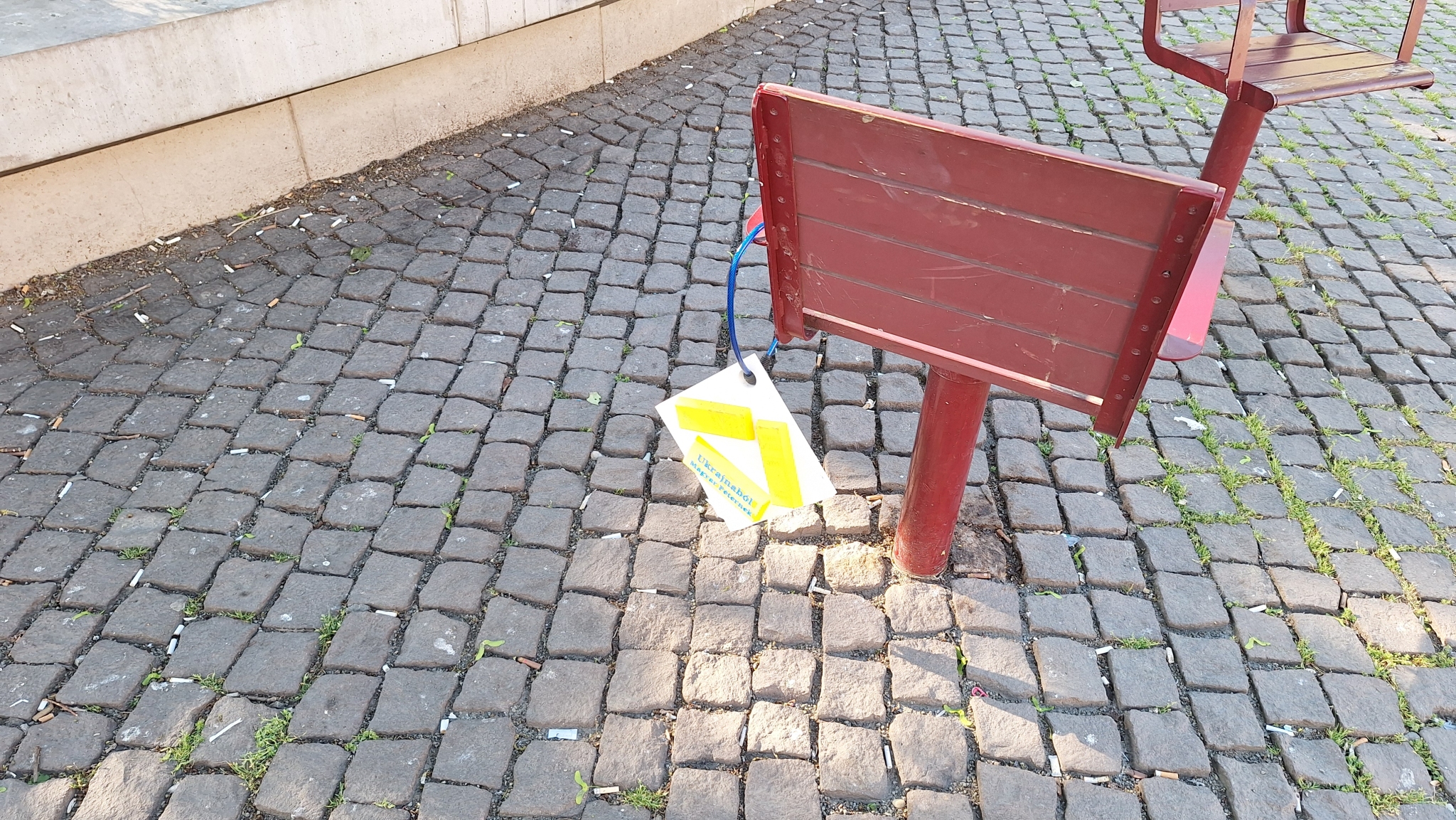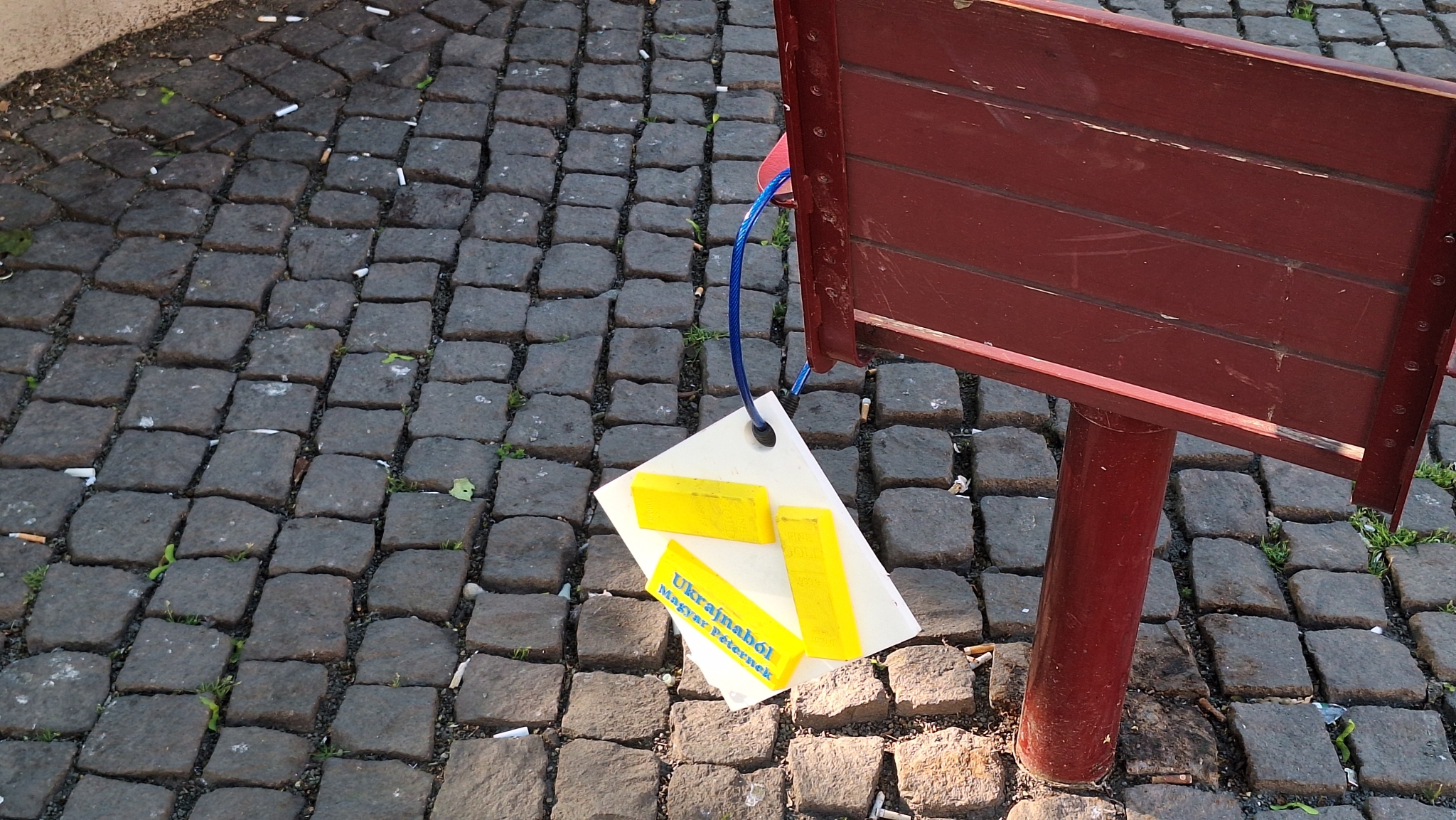 A Blaha Lujza téren a 7-es megállója melletti egyik székre van rögzítve egy propaganda szemét.