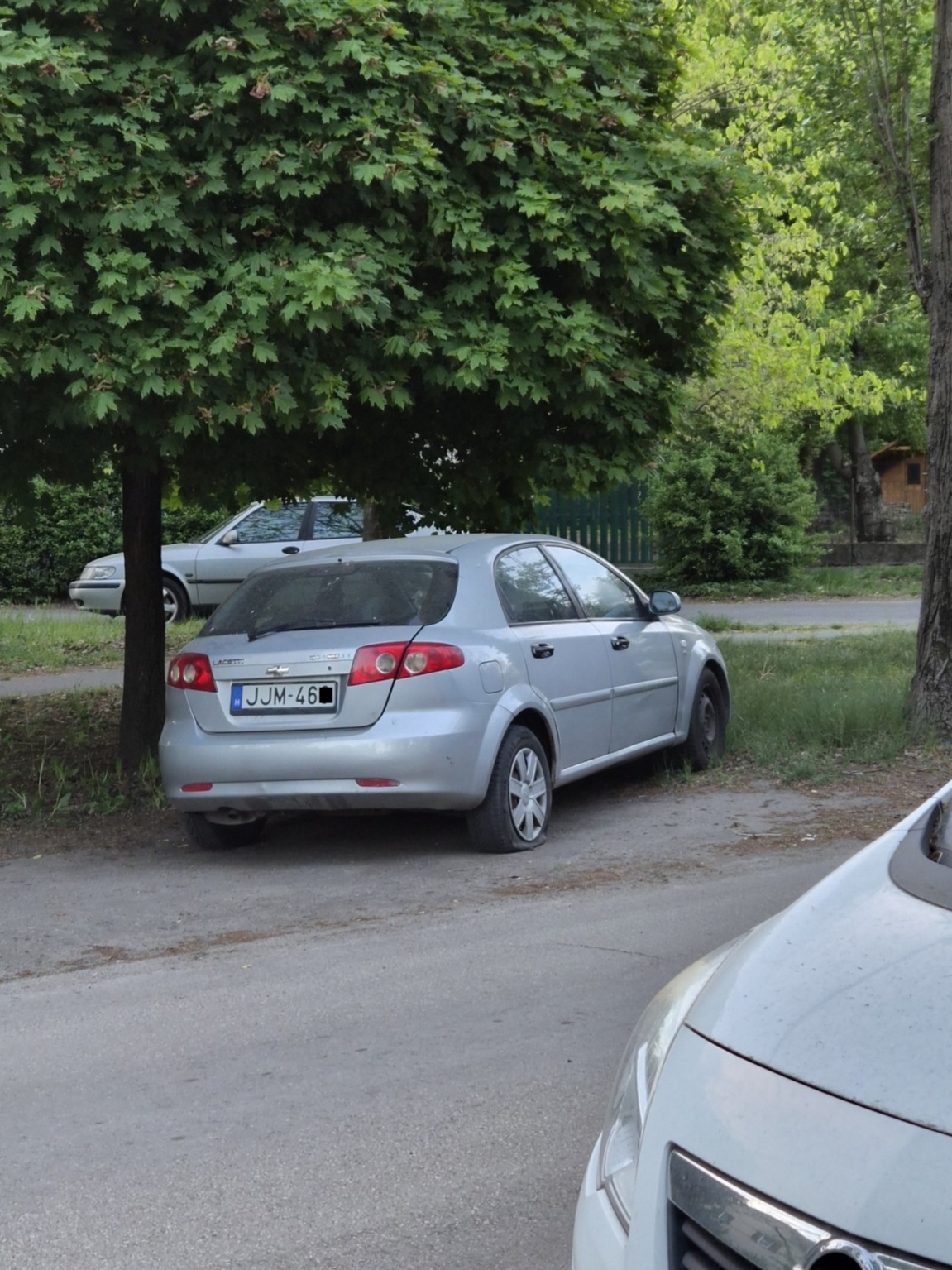 Itt hagytak egy autót a fák közè behúzva, leeresztett gumival