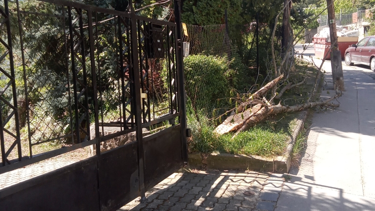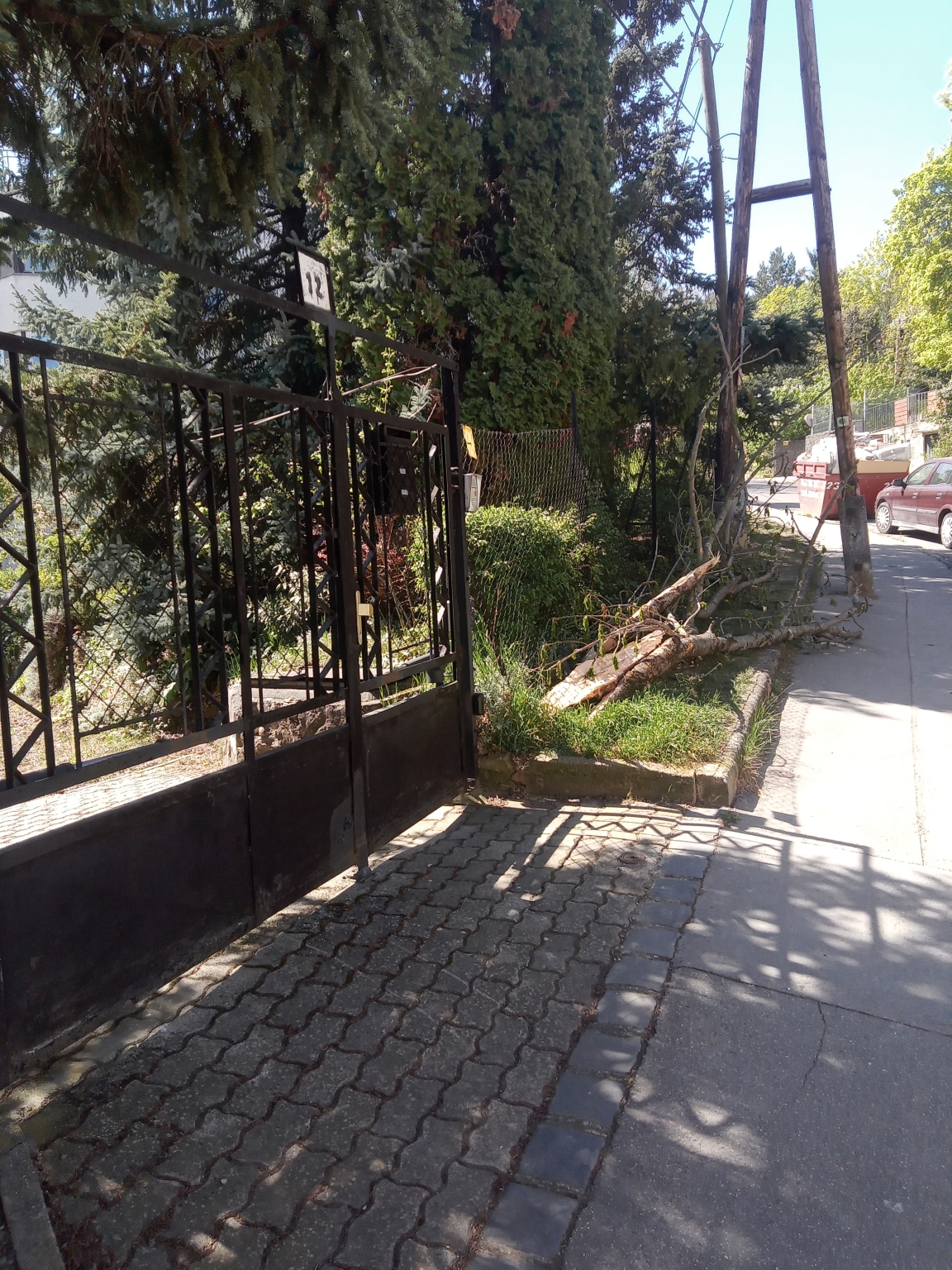 A Budapest XII.kerület Városkúti úton a 12-es szám előtt egy hatalmas letört faág akadályozza a gyalogos közlekedést. A túloldalon tört le, valaki a kerítés elé húzta.