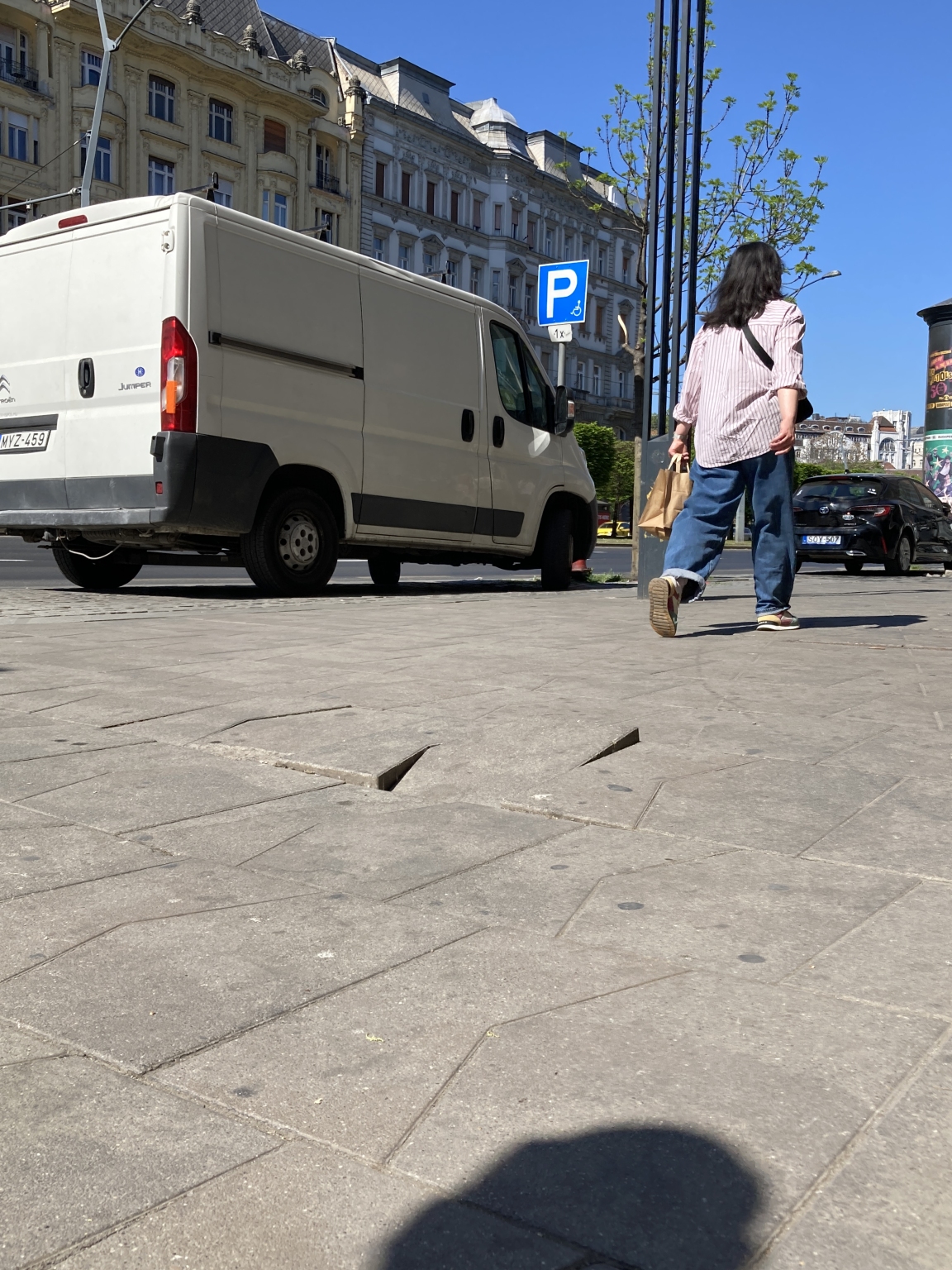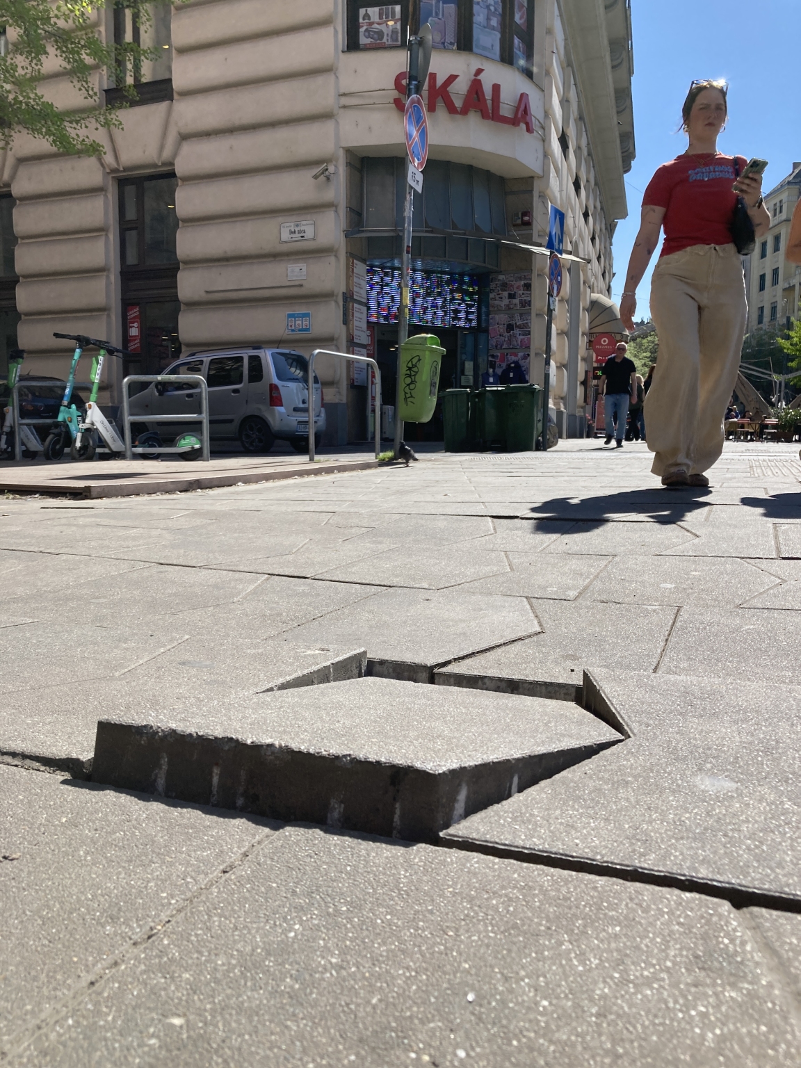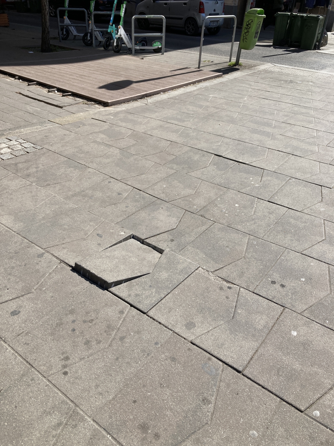 A térkő elmozdulása miatt komoly szinteltérés (kb. 7-9cm) van a járda közepén, forgalmas szakaszon.