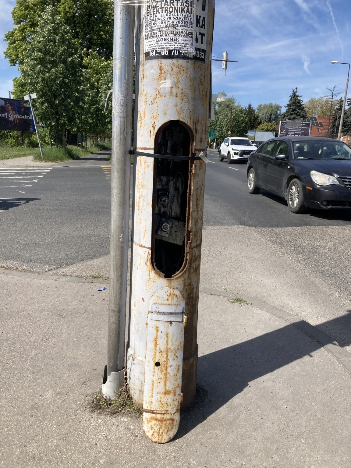 Köztéri lámpaoszlop ajtaja le van szedve (egyelőre az oszlopnak van támasztva)