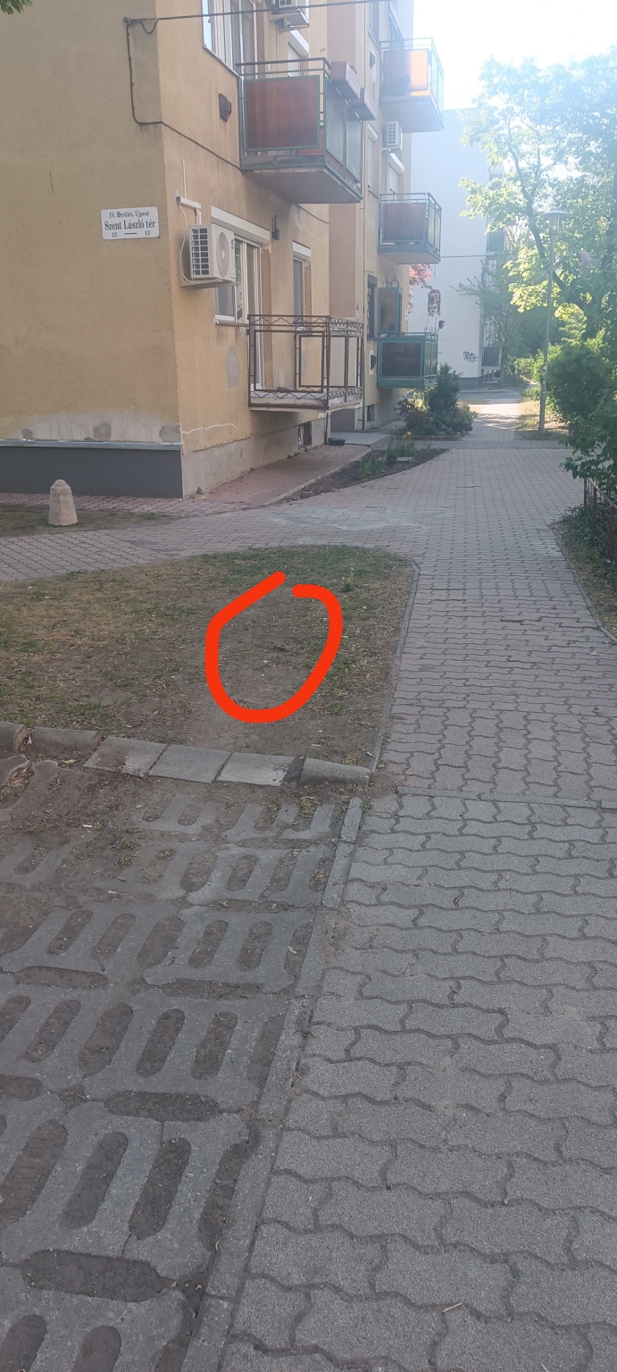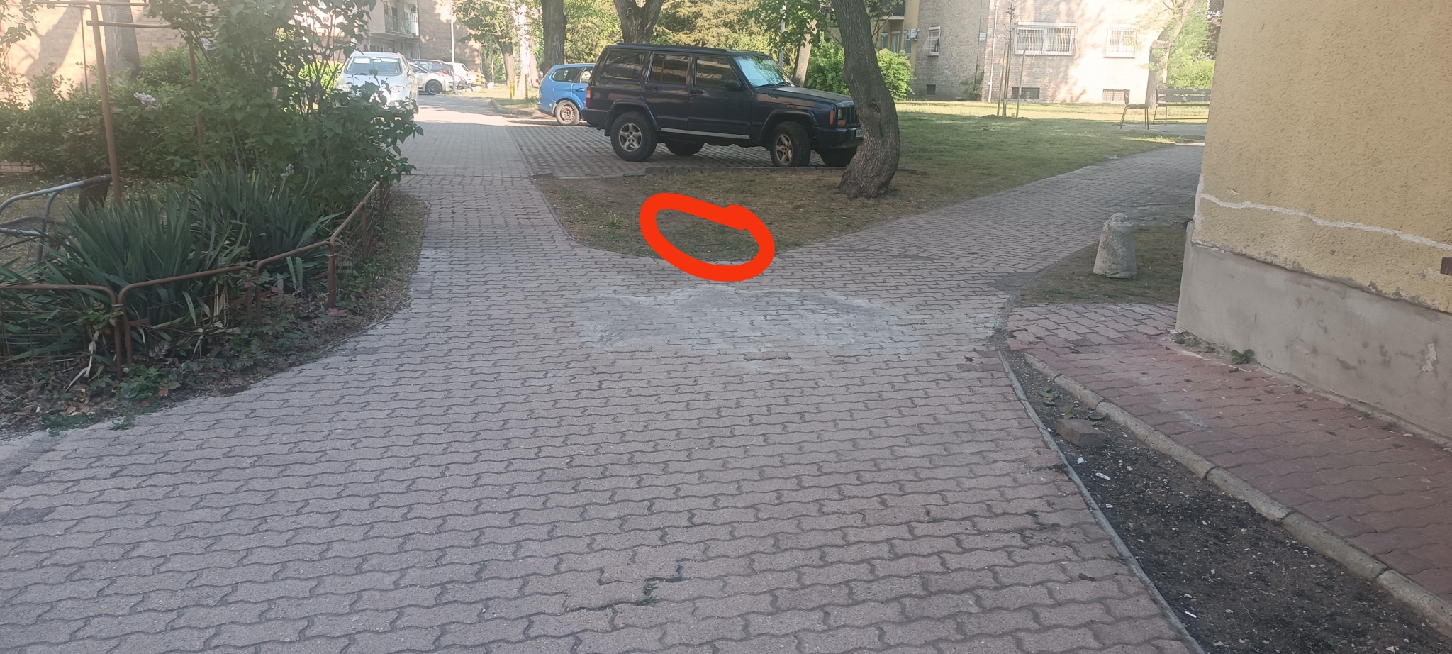 Jelzett helyen az autós (kerék) nyomból egyértelműen látszik a szabálytalanul be vagy kiparkoló gépjárművek közlekedése a járdára és a parkba. Kérem ezt behajtást gátló beton elemmel megakadályozni. Lehetőleg azzal a fajtával, aminek a át alján középen egy "leszúrásra alkalmas" fém rúd is van, hogy ne tudják elmozdítani, elgurítani. A területen arrébb van egy ilyen, az jól végzi a dolgát