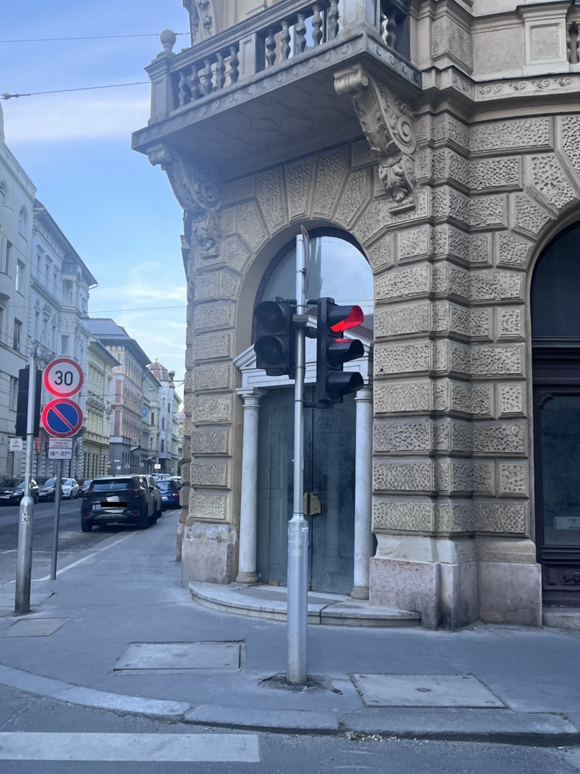 A Hol utca és a Kálmán Imre utca sarkán lévő gyalogátkelőhely, képen látható közlekedési lámpájának a zöld része nem világít. (De a piros működik.)