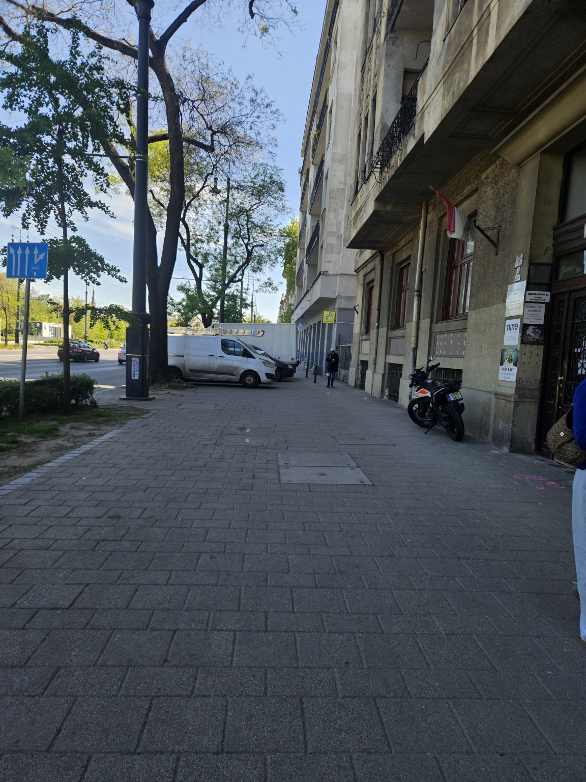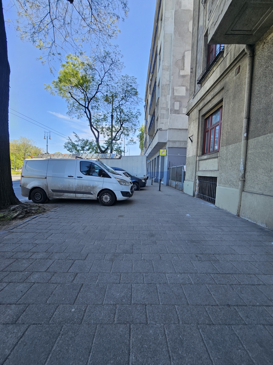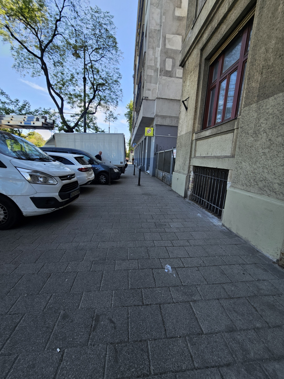 Dózsa György út 78 szám alatt a járda nagyrészét a kocsibehajtó elé parkolt járművek foglalják el.