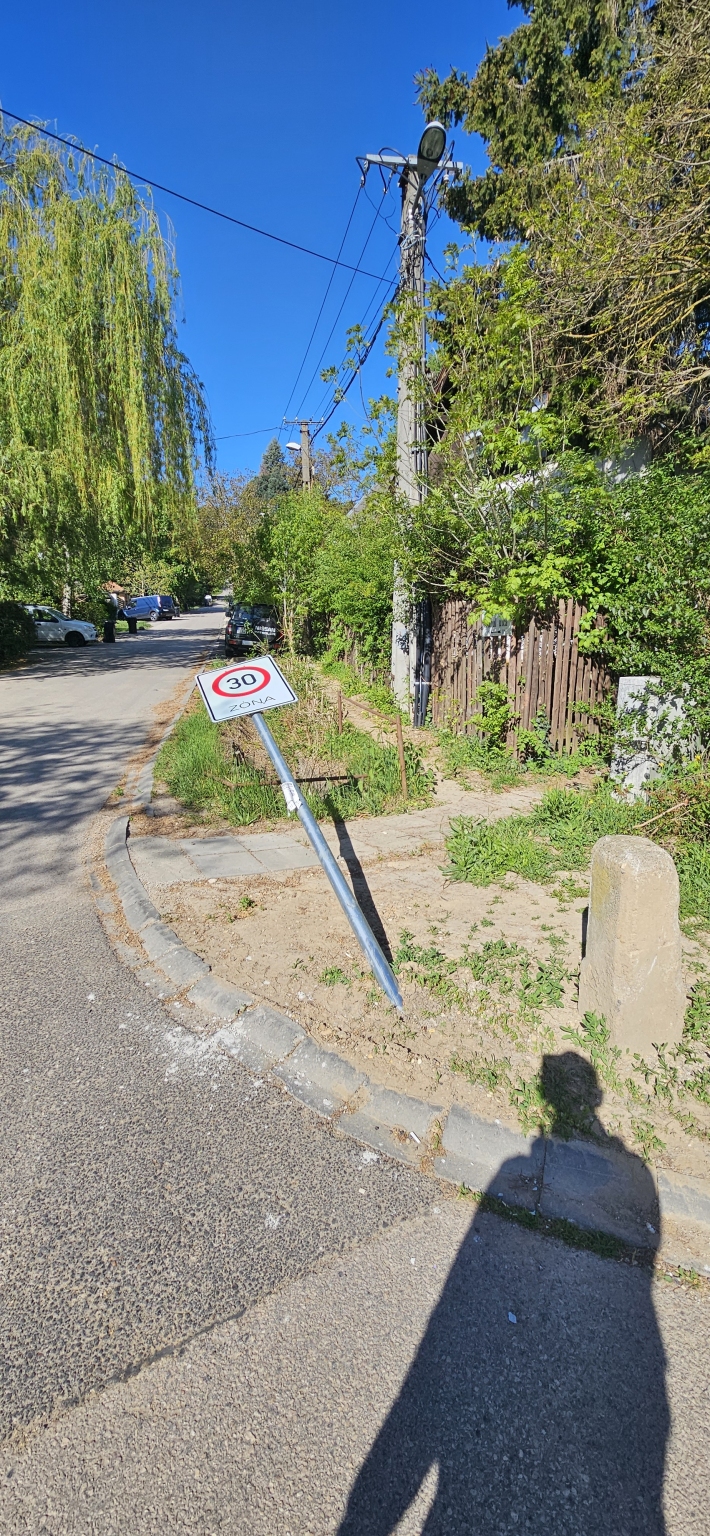 Az Ördögárok utca és a Turul utca sarkán a 30-as Zóna kezdete tábla ki lett döntve.
