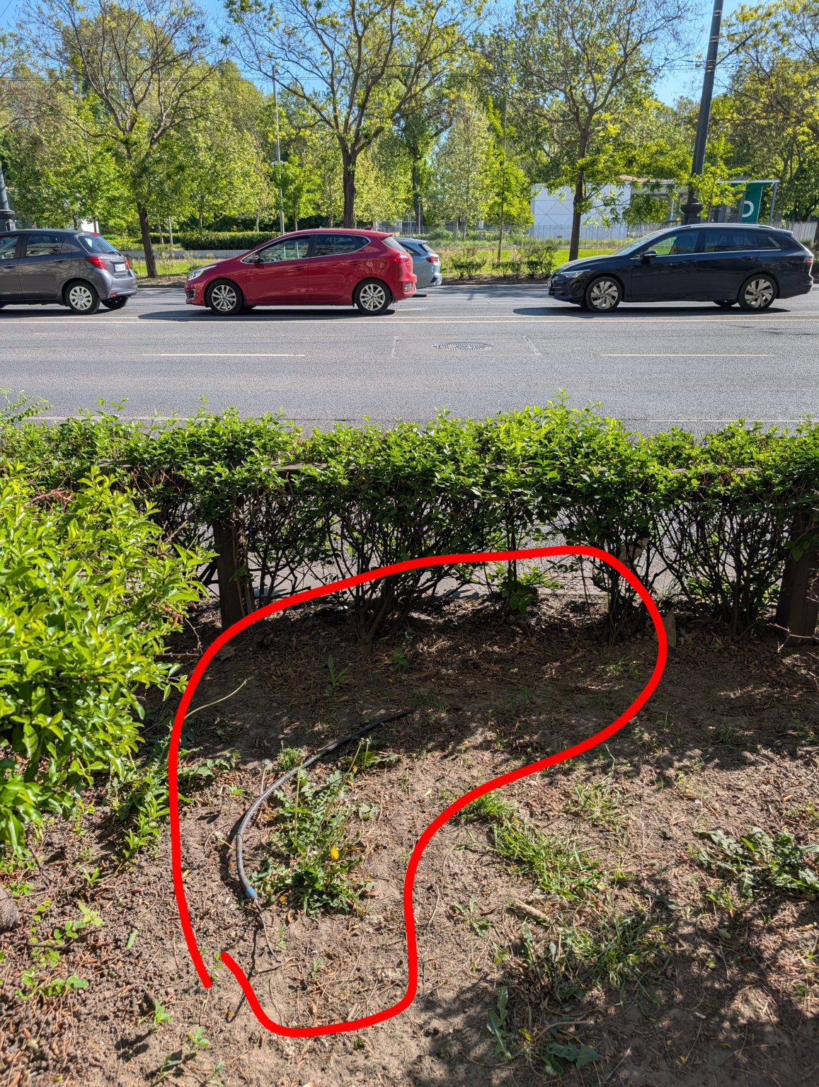 A Dózsa György út 66 előtt a sövény egy szakaszán van egy szigeteletlen kábel. Nem tudni mi van a végén, feszültség alatt van-e.