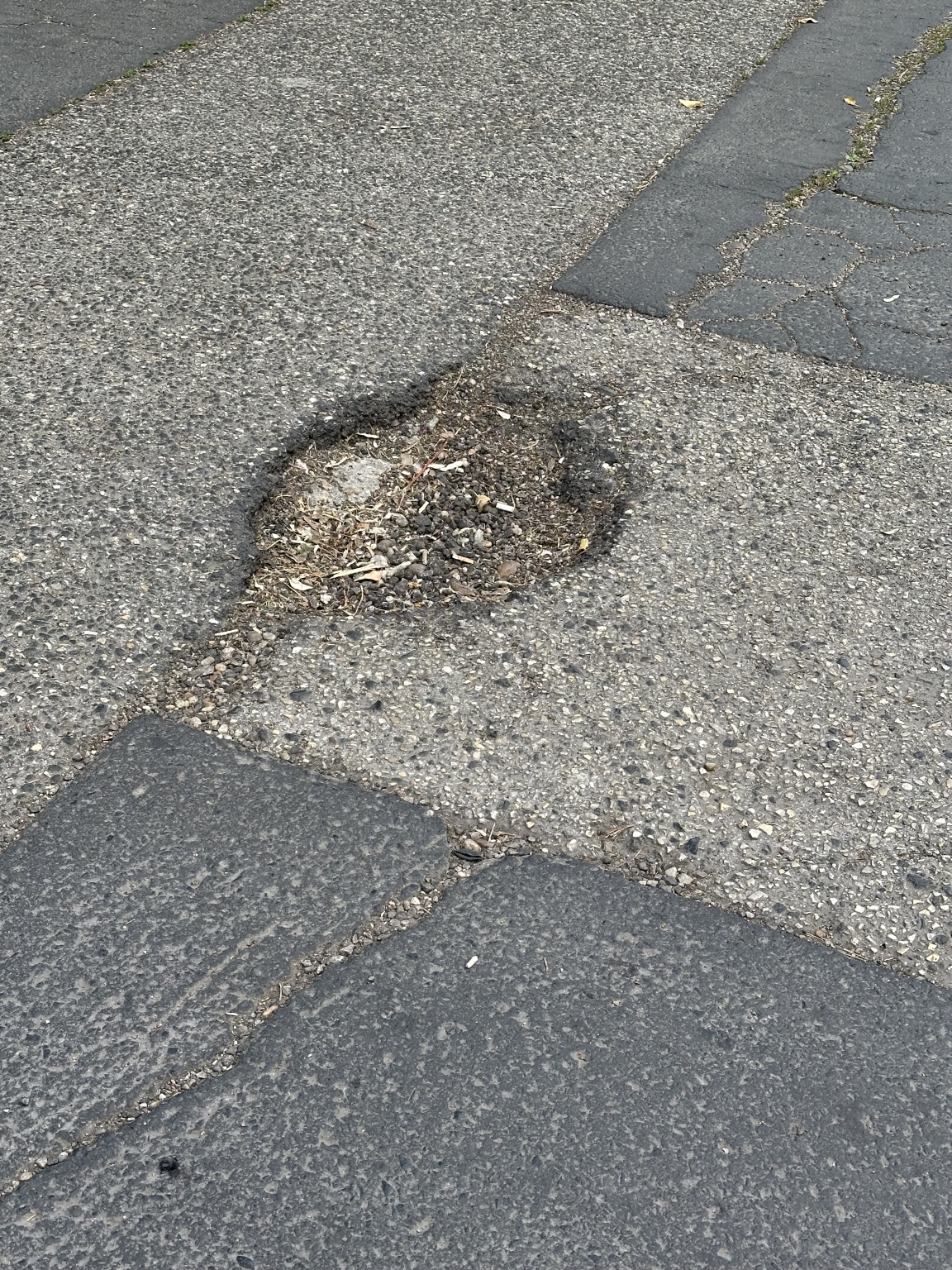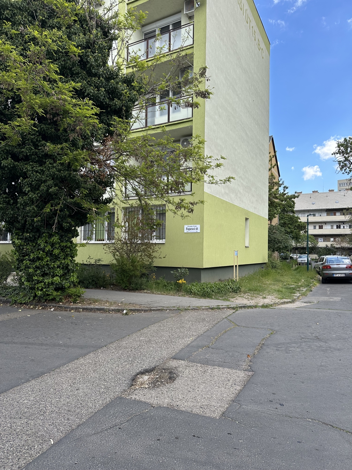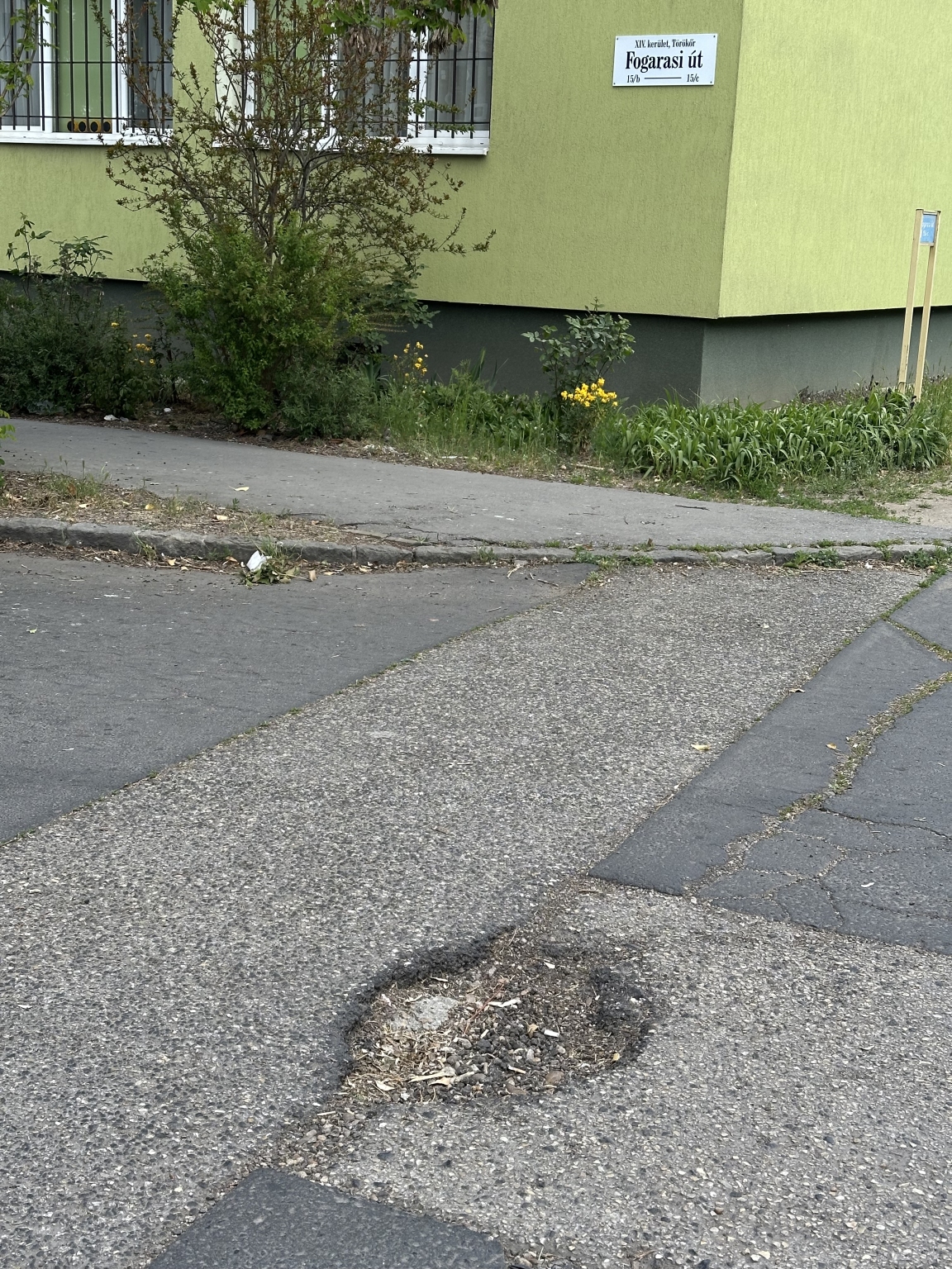 A XIV. ker Fogarasi út 15/b-c alatt lévő ház C lépcsőháza előtt egy lyuk van a sarkon .