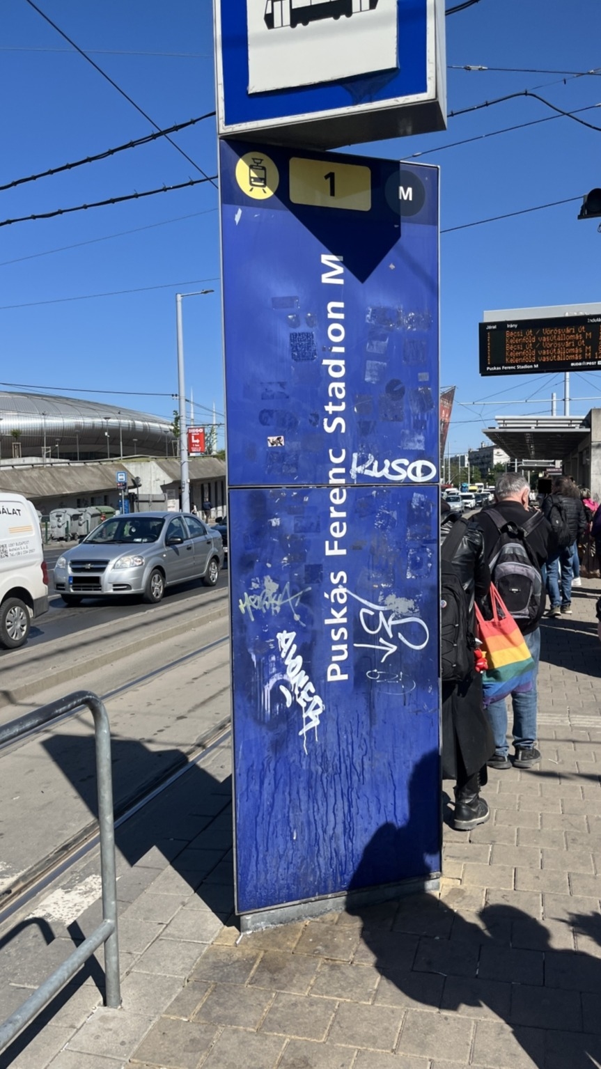 A Puskás Ferenc Stadionnál, a villamosmegállóban nagyon koszos a villamosmegálló tábláját is tartó oszlop. Foltos, graffitis, ragad is valami megkérdőjelezhető folyadéktól. Az oszlop így bárki ruháját beszennyezheti, aki véletlenül nekidől. Legyenek szívesek soron kívül intézkedni a takarításáról és annak rendszeresítéséről! Köszönöm.