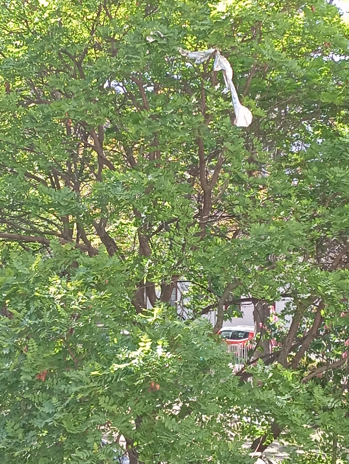 A Brunszvik Júlia téren a Leonardo utca felől van egy fólia a fán már legalább 8 hónapja. Ezt akár márciusban, a Nap utcai fák ápolásakor is le lehetett volna szedni.