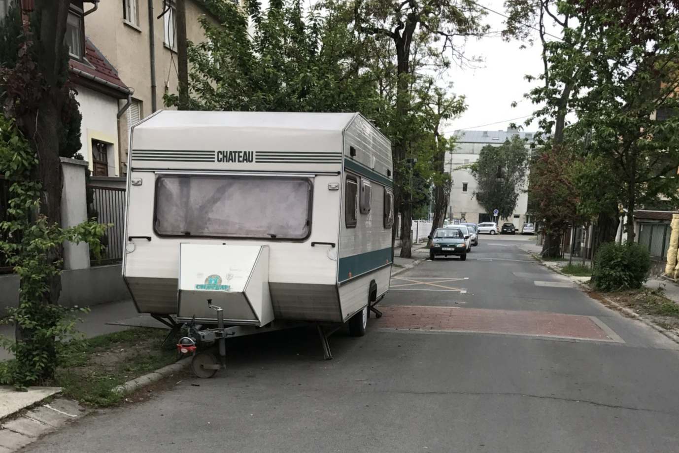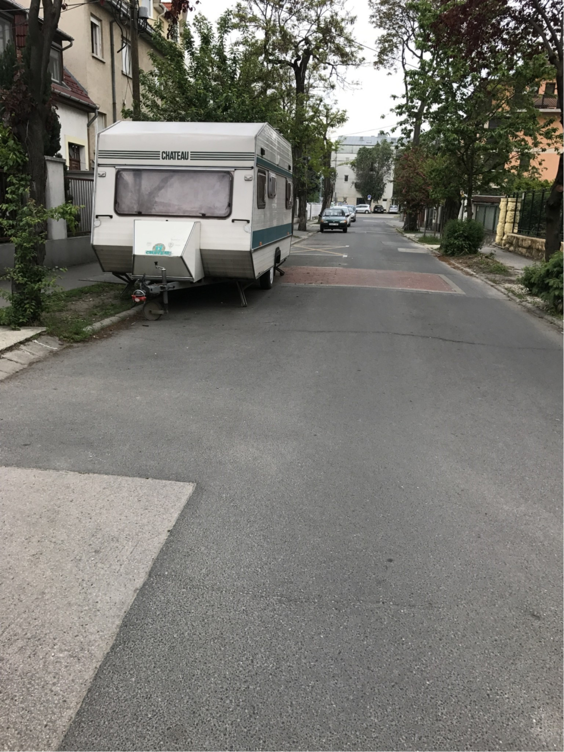 14. Kerületi Beckó utcában a képen látható lakókocsi több hete foglalja a helyet az utcában lakók elől. Így is limitált a parkolók száma...két kisebb autó beférne a helyére.