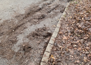 Kispesten, a 42-es villamos Corvin körút megállójának (Határ út felé) kukája nincs rendesen a helyén, ferdén lóg.