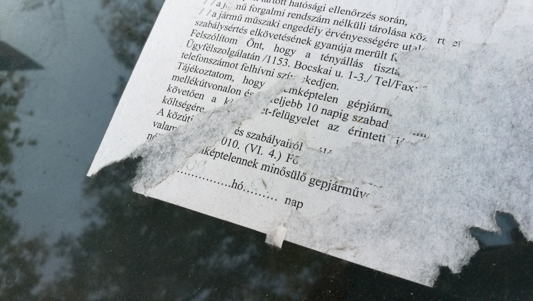 Elhagyott Ford Escort parkol a Wesselényi utcában, a vásárcsarnok és az M3-as közti szakaszon. Vélhetően tud már róla az illetékesség (a ráragasztott figyelmeztetésen 09. hó 04-e olvasható), az autó azonban másfél hónap múltán is ott áll. A hátsó rendszám plakettjének tanúsága szerint a műszaki érvényessége augusztusban lejárt, Ügyfélkapus lekérdezés alapján nincs forgalomban.