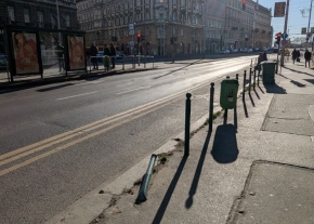 A következő bejelentést villámgyorsan orvosolta a BUDAPEST KÖZÚT Zrt. (amit ezúton is köszönünk szépen!), de sajnos az oszlopokat ismét kidöntötték...