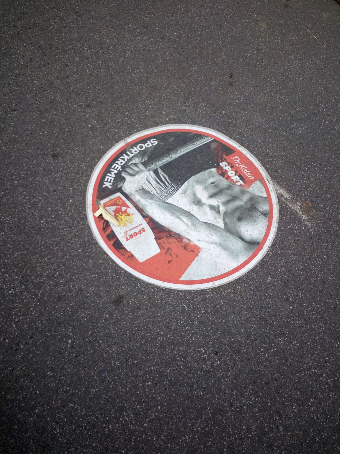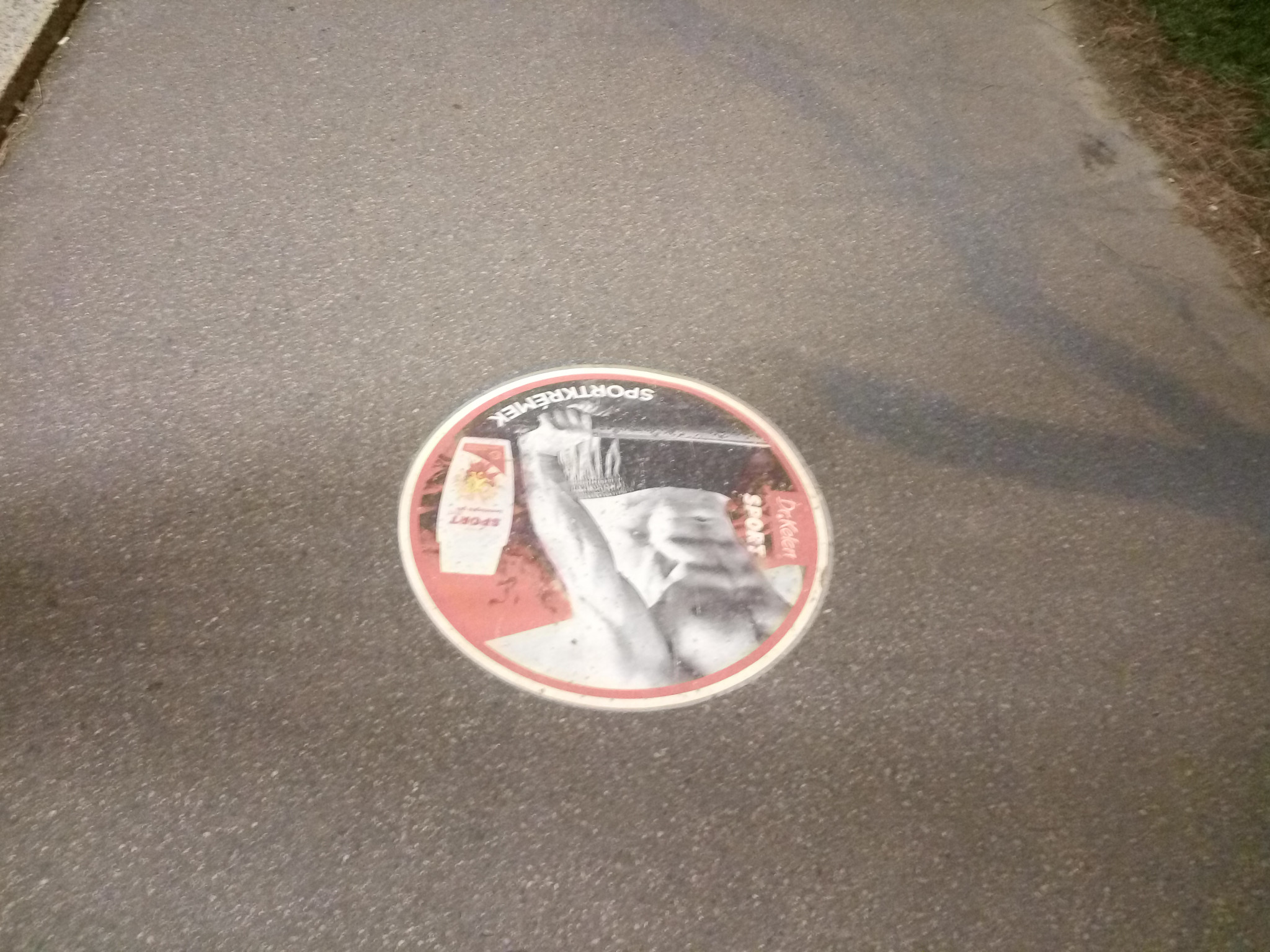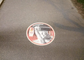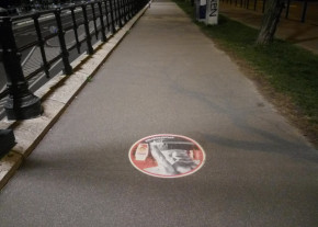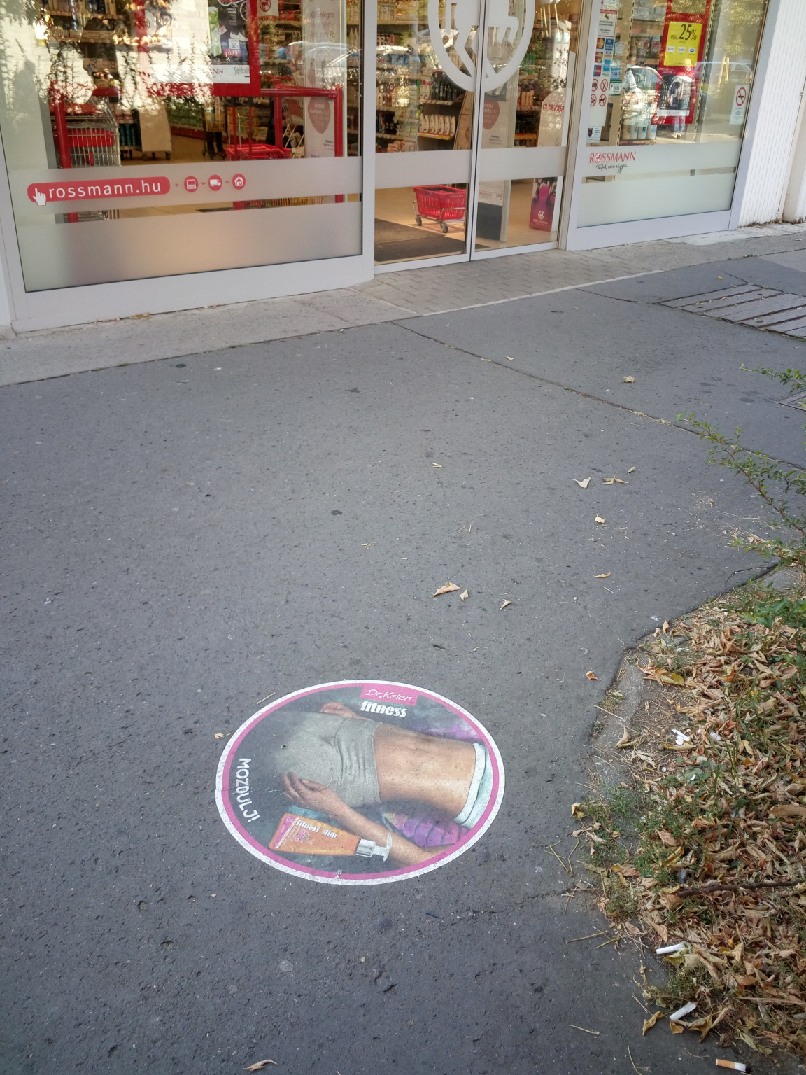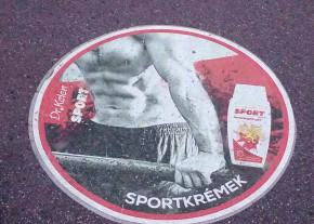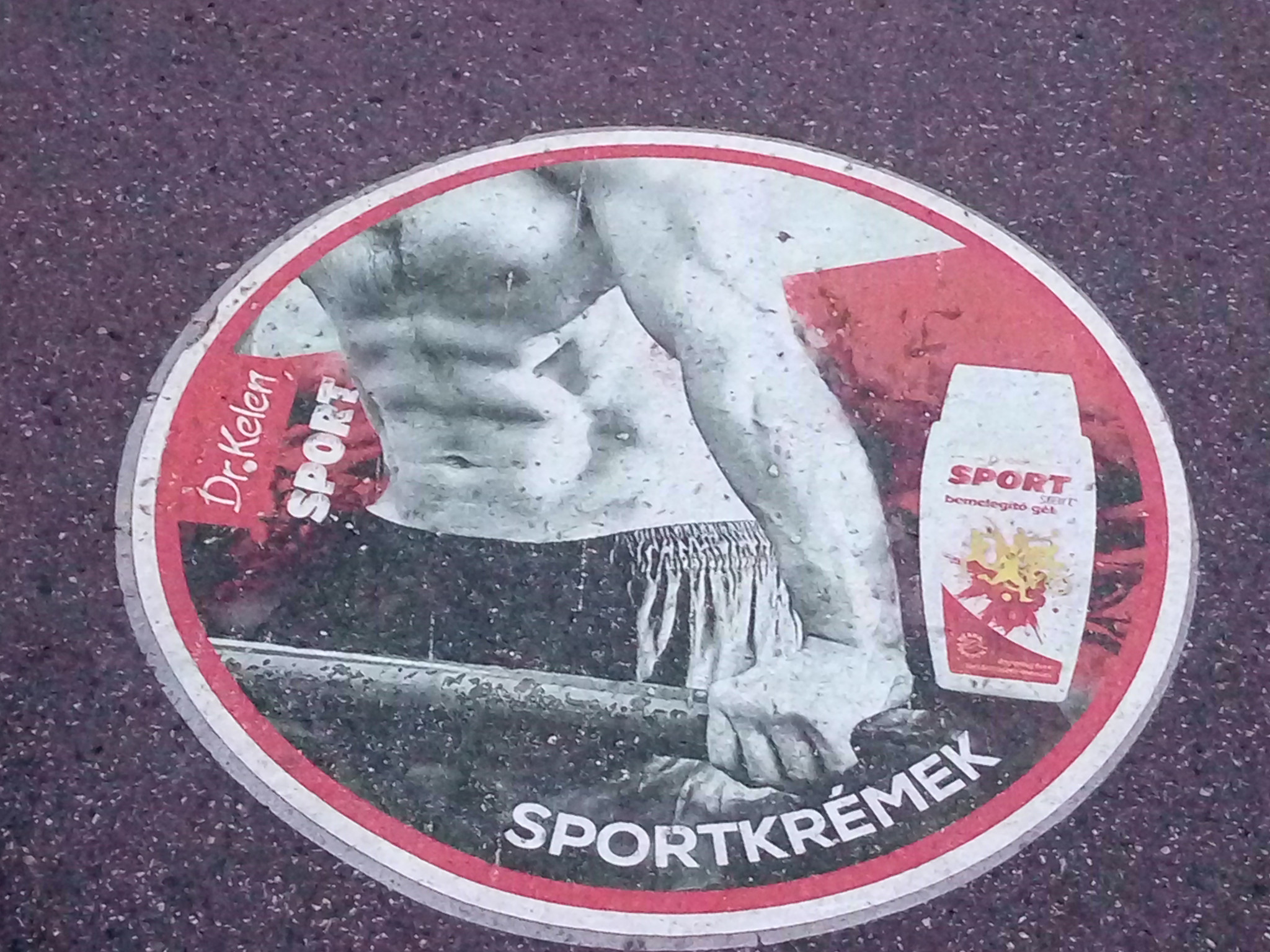 Sportkrémet reklámozó felfestések az Újpesti rakpart járdáján több helyen, ez a kép a Szent István park mellett készült.