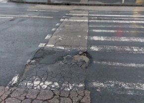 Hatalmas "kátyú", megsüllyedt fedél! Ezt minél hamarabb javítani kell! Dózsa György úti iskolánál van.