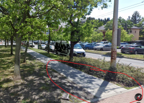 A járdán van egy nagy lyuk (betört a beton, alatta gödör). Egy fotelt (!) tettek fölé, hogy senki ne essen bele.