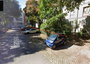 Egy (évek óta) kiszáradt bálványfa a parkolóban, mely kidőlésével komoly személyi sérüléseket és tetemes anyagi kárt okozhat.